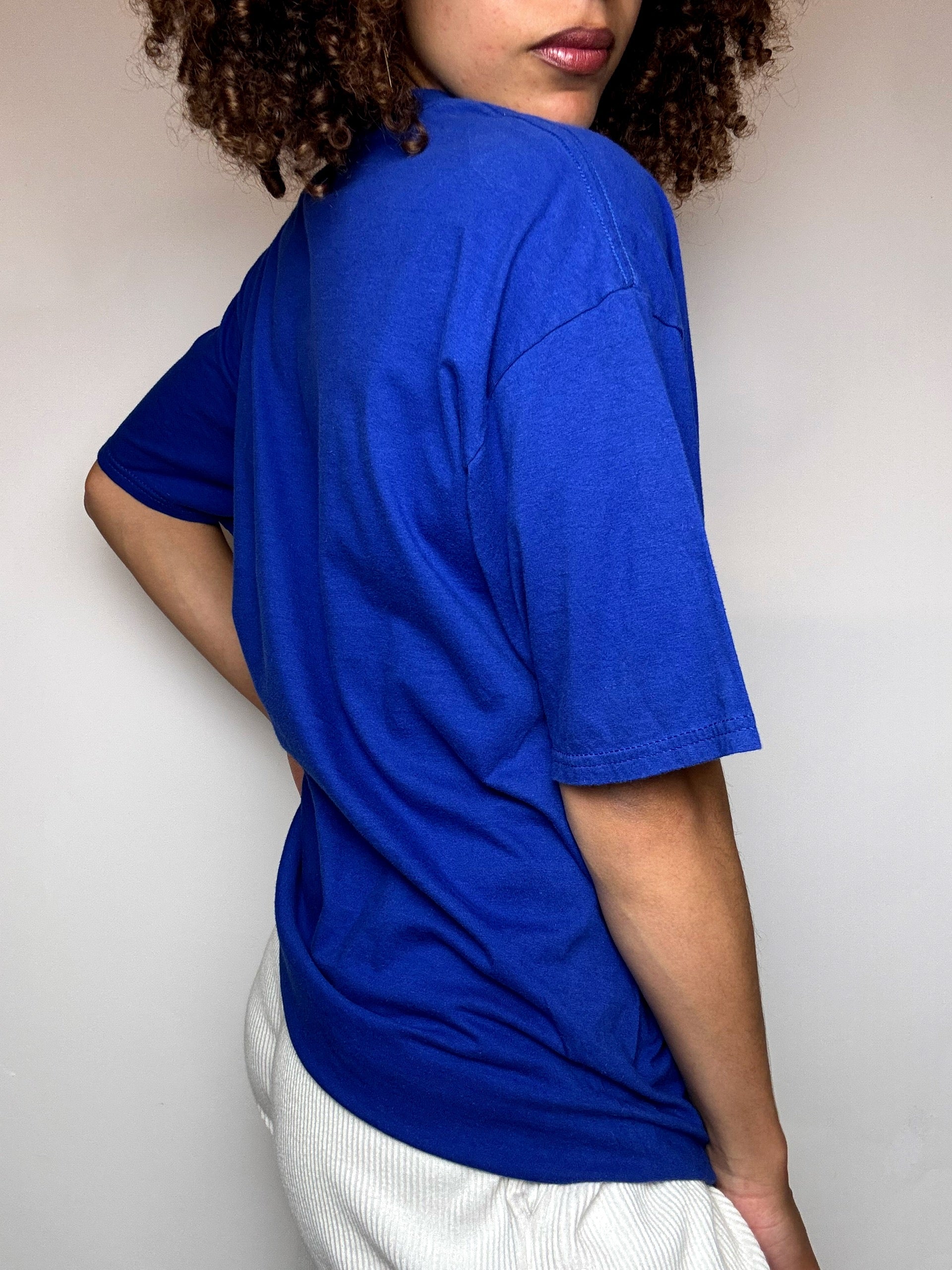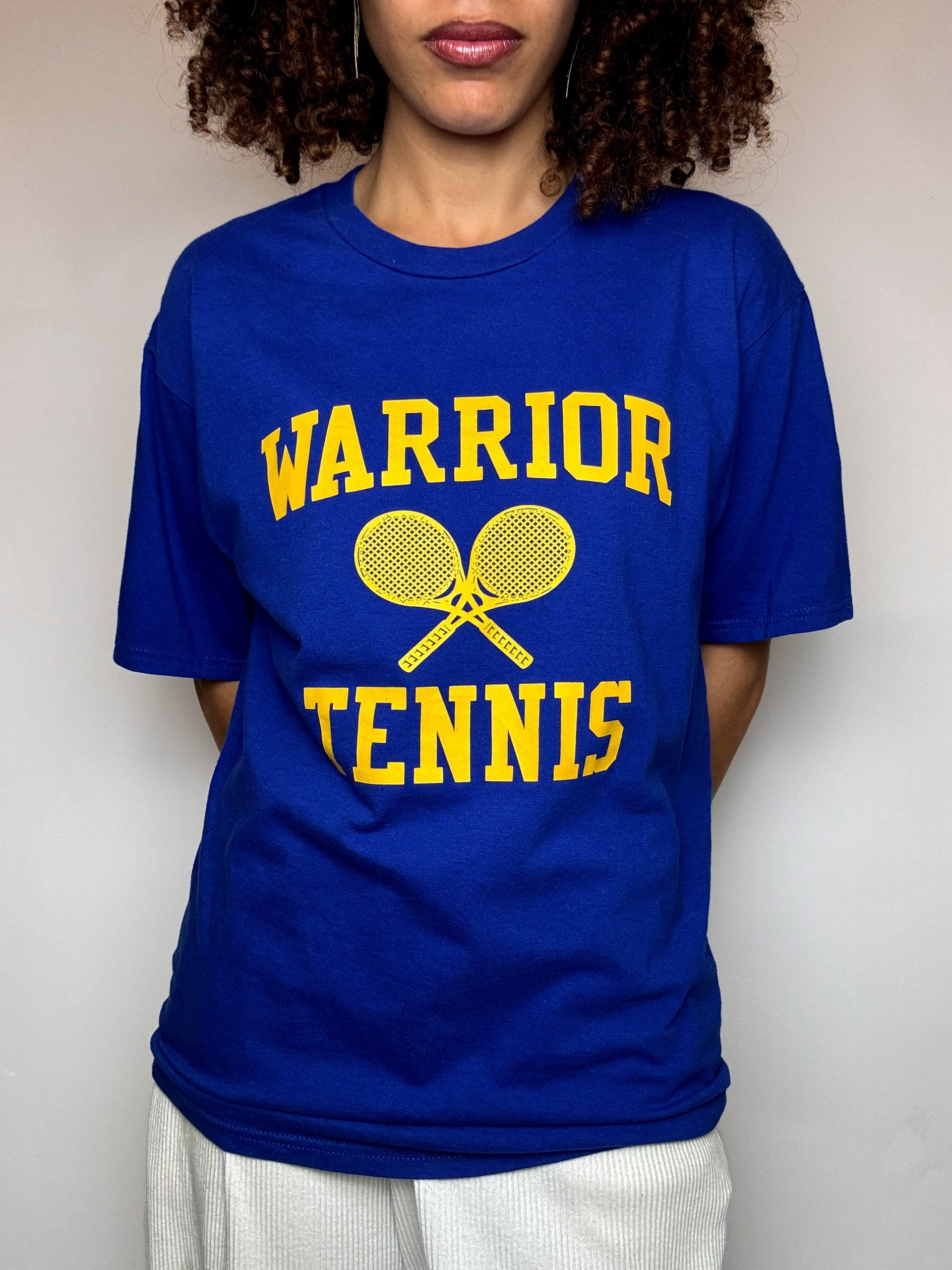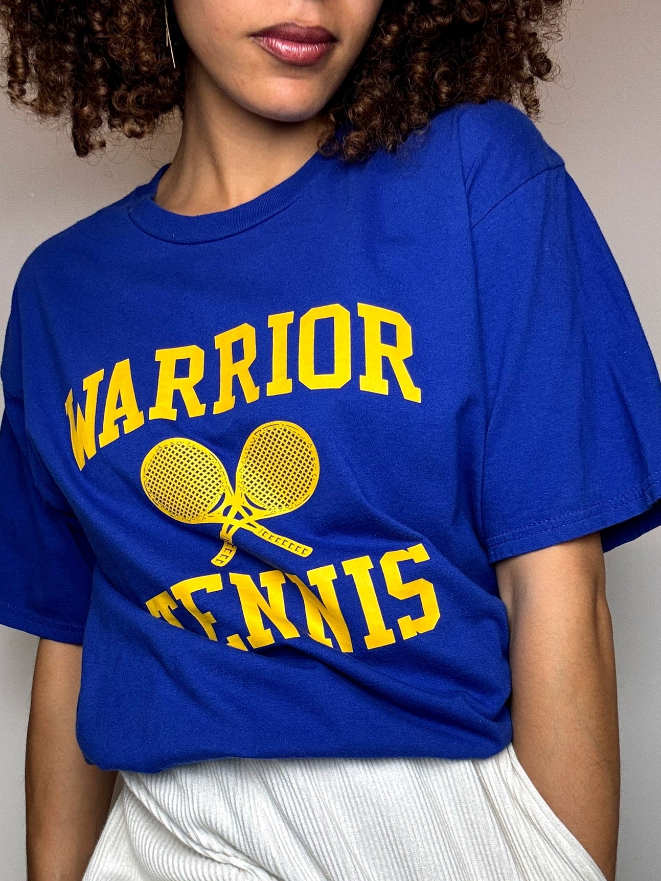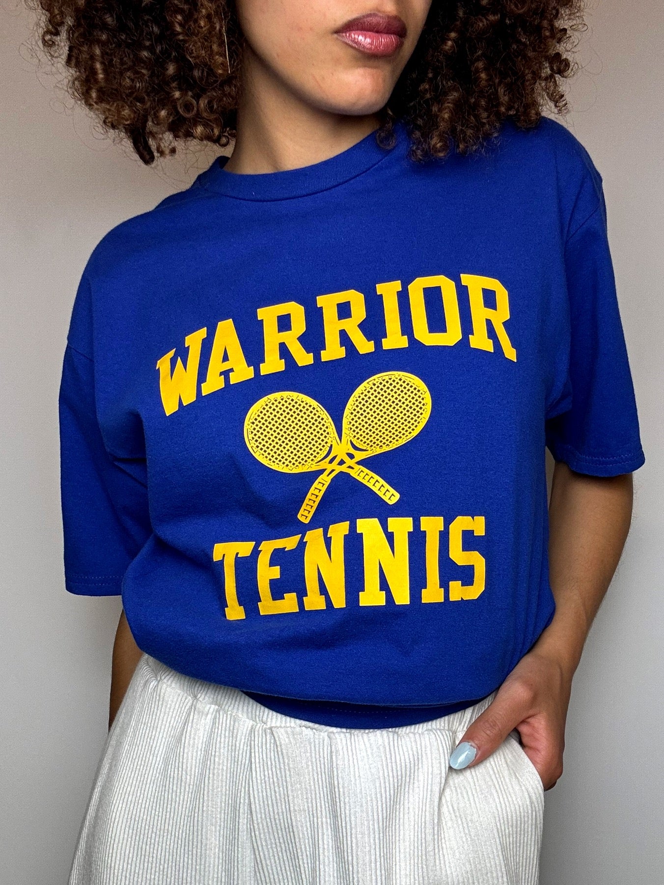 Tee-shirt bleu au visuel sportif percutant, avec l’inscription "Warrior Tennis" en jaune et deux raquettes croisées stylisées au centre. Un design typique des tenues d’équipes lycéennes ou universitaires américaines, souvent porté lors de tournois inter-écoles. Une pièce vintage au charme athlétique, parfaite pour adopter une vibe varsity tennis club.