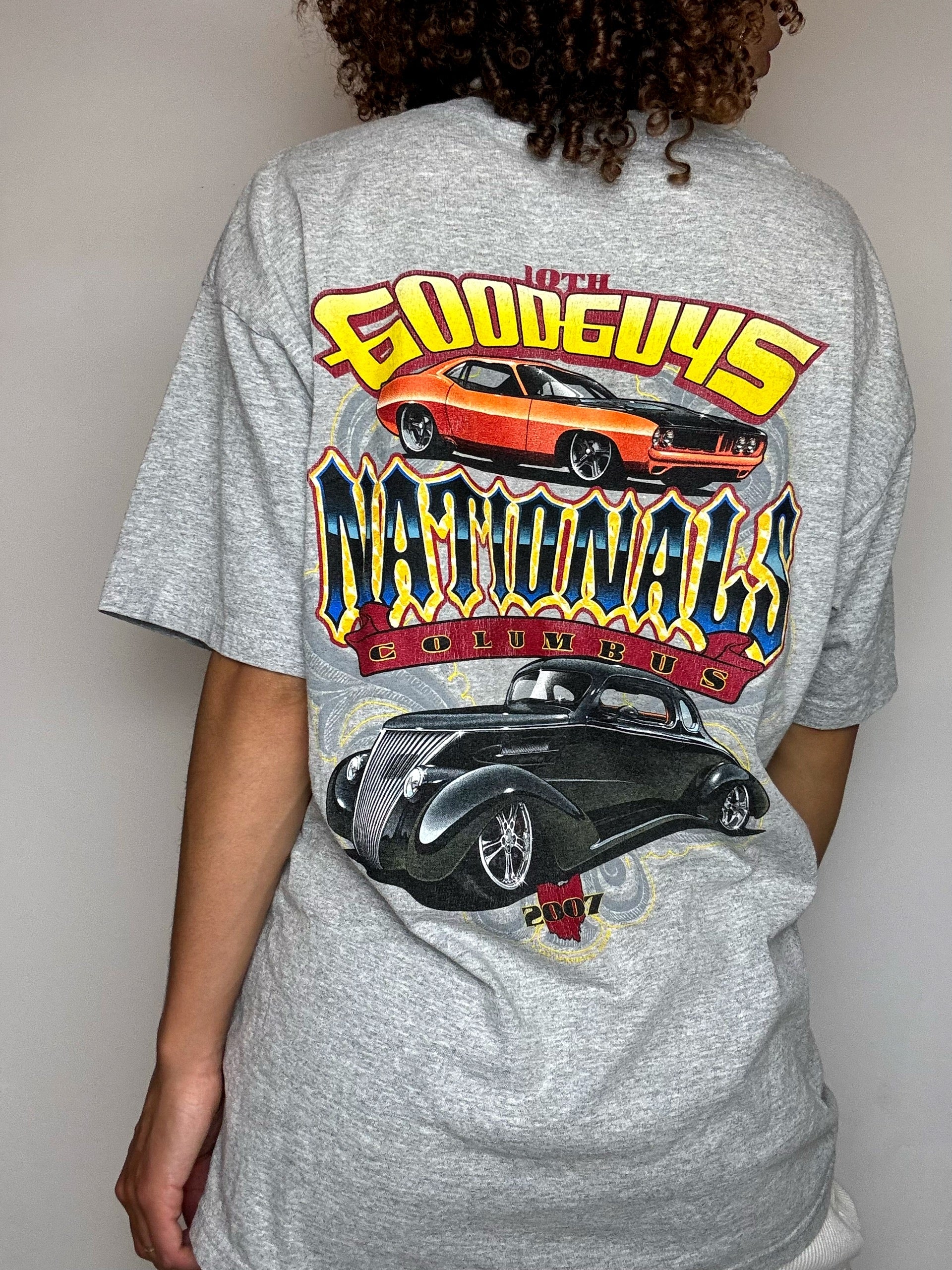 Un classique pour les passionnés d’automobile ! Ce tee-shirt gris rend hommage à la 10ème édition des Goodguys Nationals à Columbus en 2007, l’un des plus grands rassemblements de voitures classiques et hot rods des États-Unis. Au dos, un visuel stylisé d’une voiture ancienne célèbre l’esprit vintage et custom qui fait la renommée de cet événement incontournable.