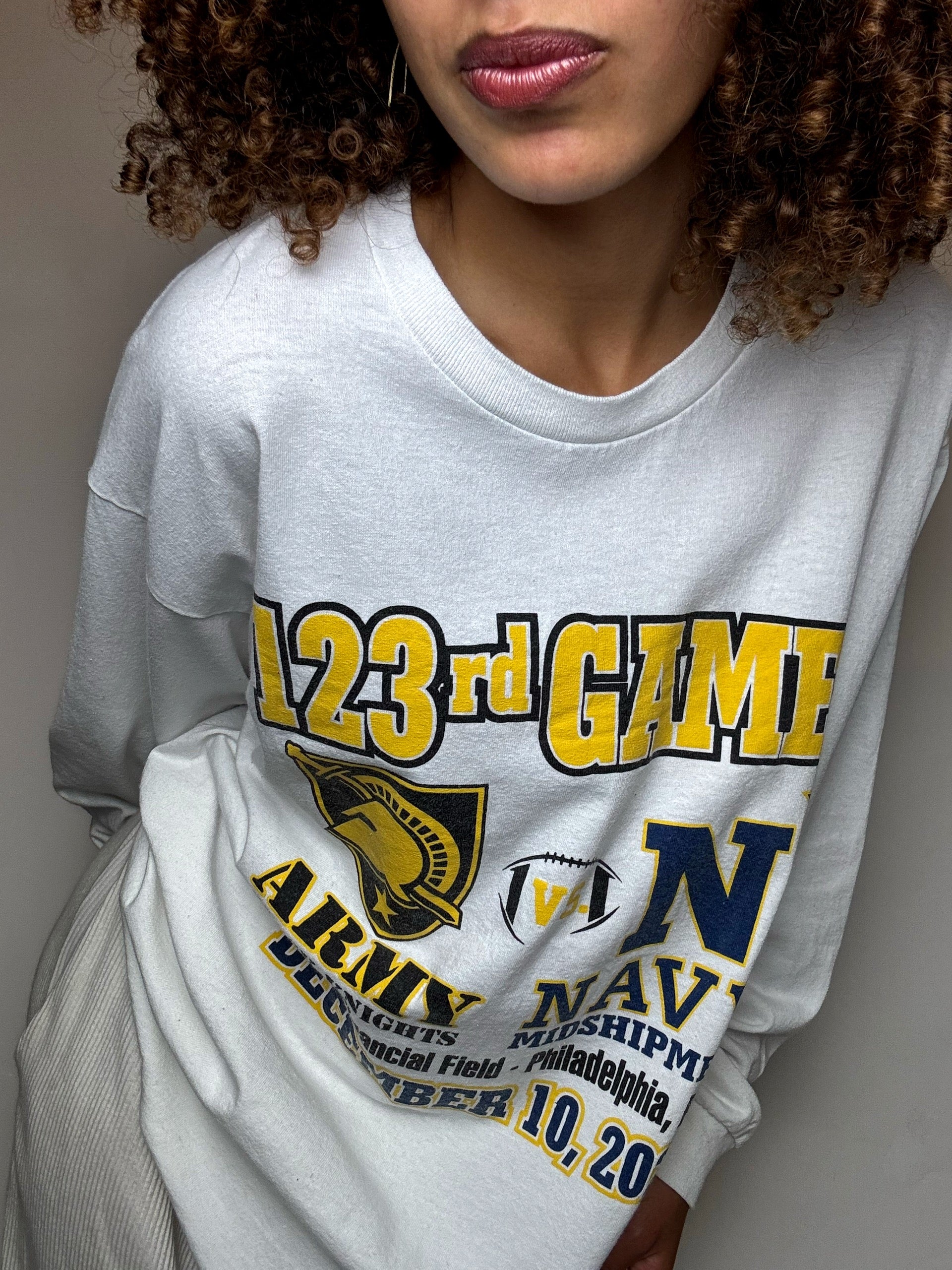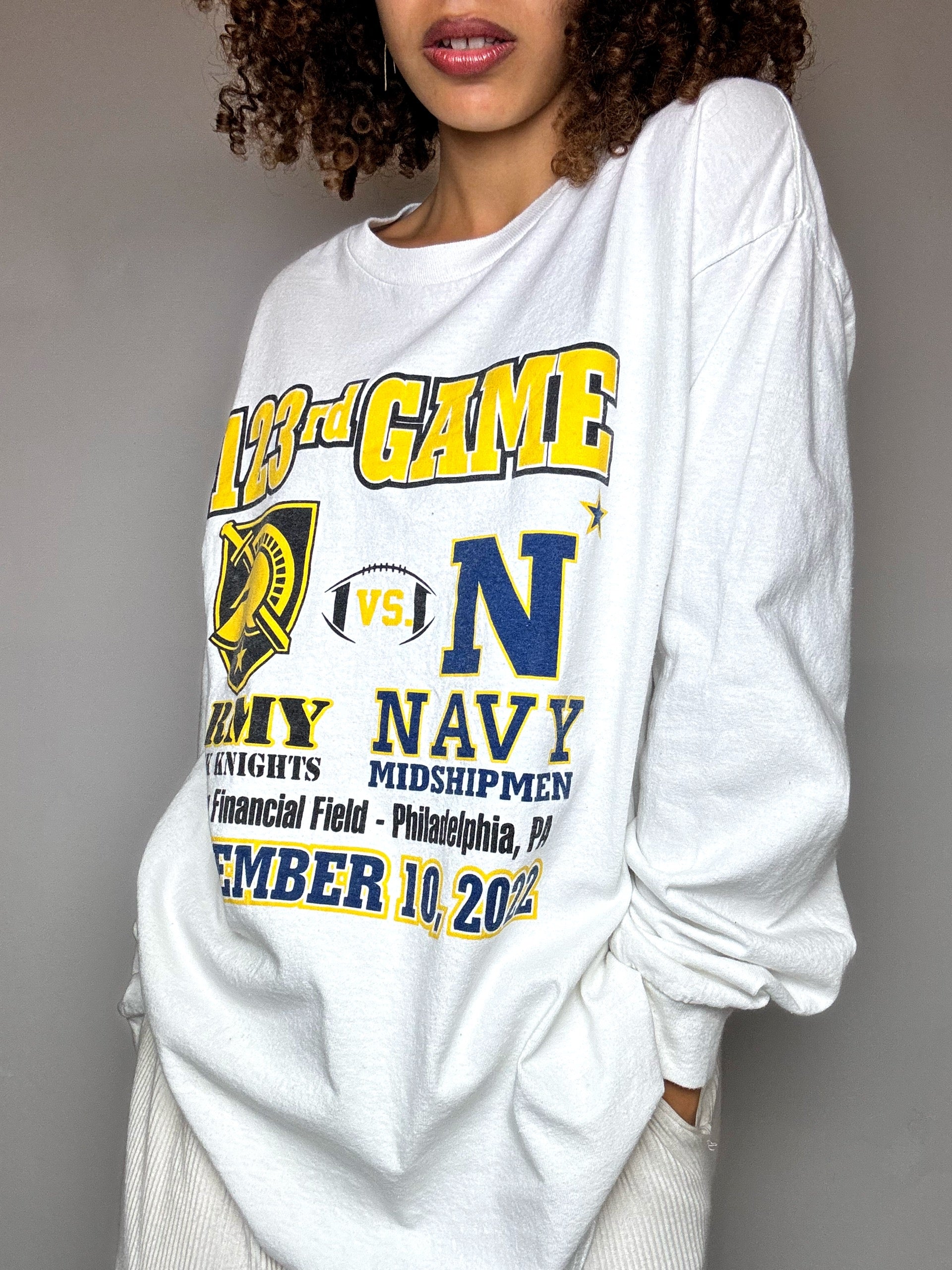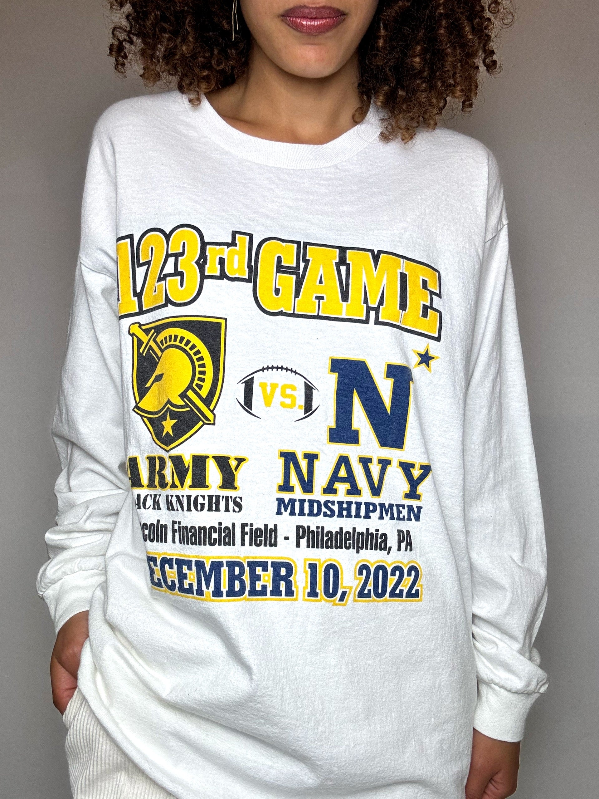 T-shirt blanc à manches longues célébrant le 123e match annuel entre l'Army et la Navy, un classique du football universitaire américain. Organisé le 10 décembre 2022 au Lincoln Financial Field à Philadelphie, cet affrontement historique oppose les Black Knights de l’US Army (logo casque romain et épée) aux Midshipmen de l’US Navy (logo N avec étoile). Détails jaune vif à l’avant, parfait pour les fans de college football, de military wear ou les amateurs de pièces commémoratives.