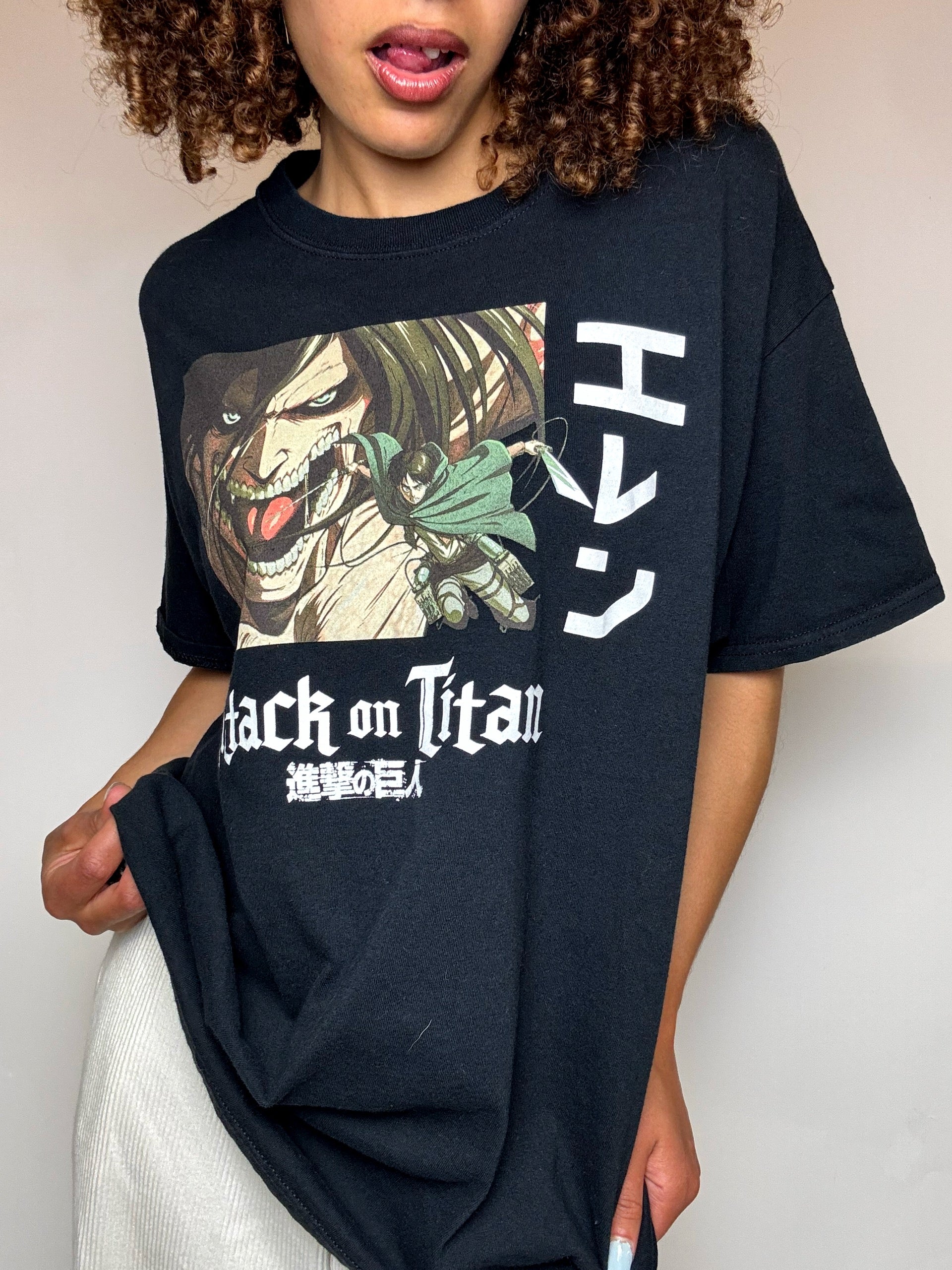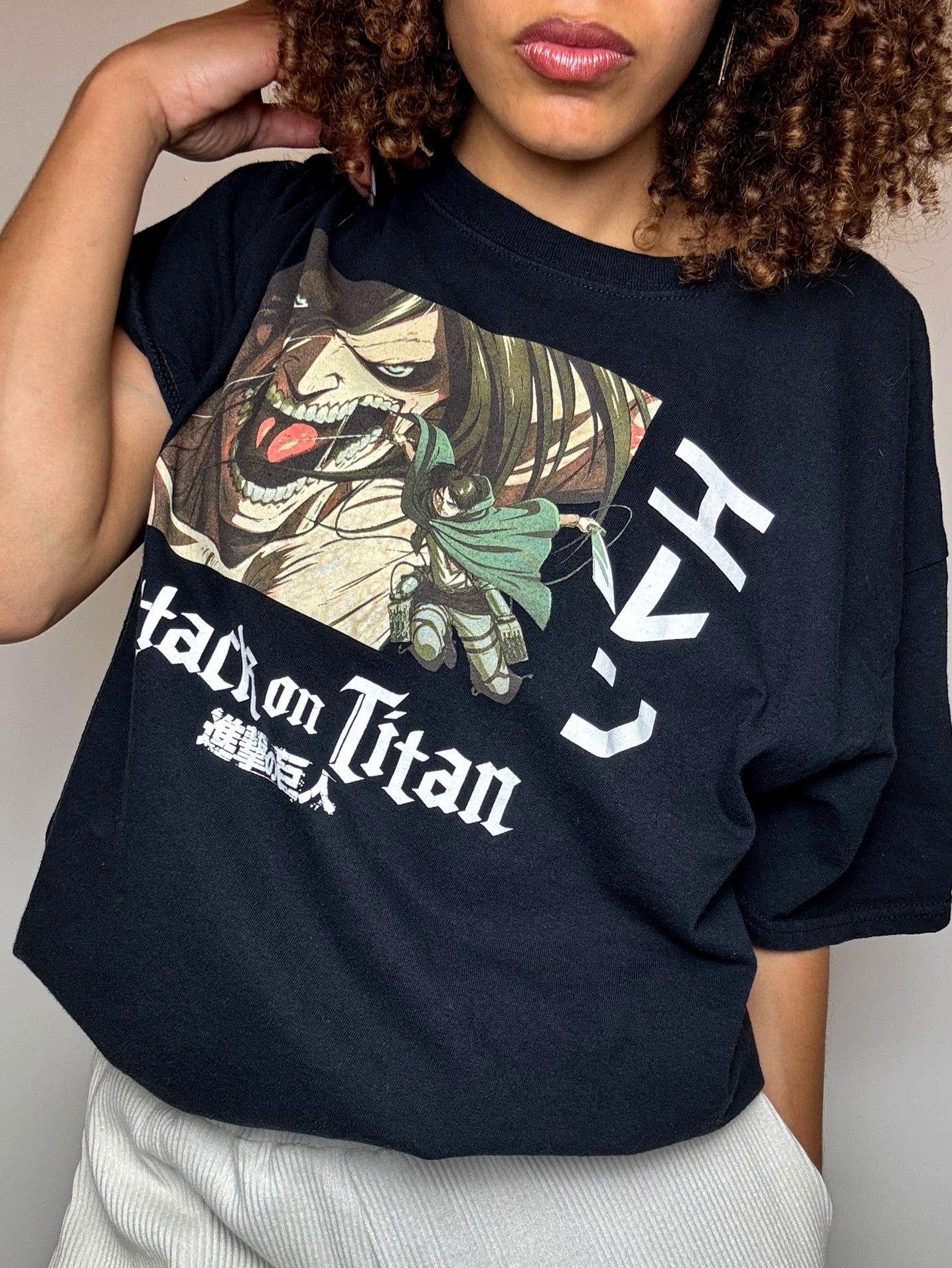 Visuel intense pour ce tee-shirt officiel Attack on Titan : un Titan menaçant en arrière-plan, face à Levi Ackerman, le caporal du Bataillon d’exploration prêt à trancher. Design inspiré des scènes les plus iconiques de l’anime, entre tension, vitesse et rage de vaincre.