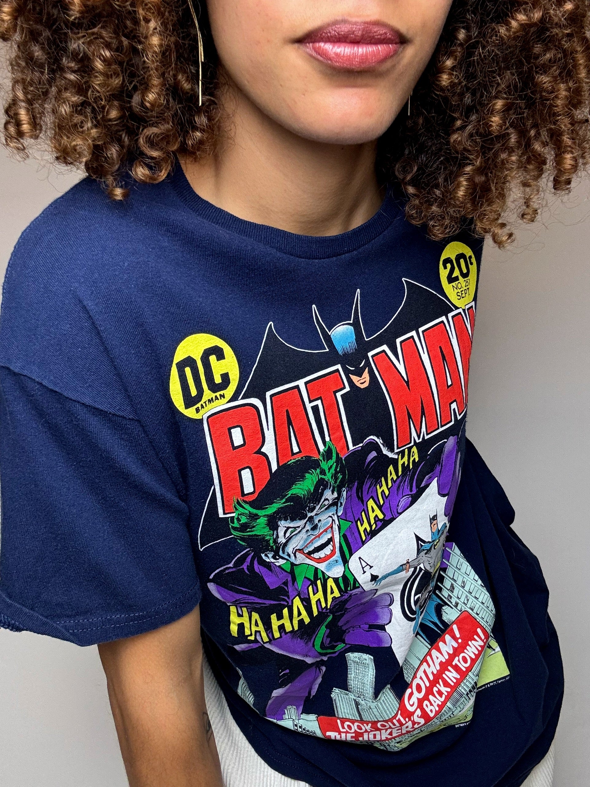 Sur la couv' originale de ce numéro, le Joker est mis en avant dans une posture théâtrale, tenant une carte géante avec Batman dessus — une image qui a marqué l’histoire des comics. Le visuel de ton tee-shirt reprend donc cette couverture mythique, avec les mentions "20¢ No. 251 SEPT", exactement comme à l’époque.
