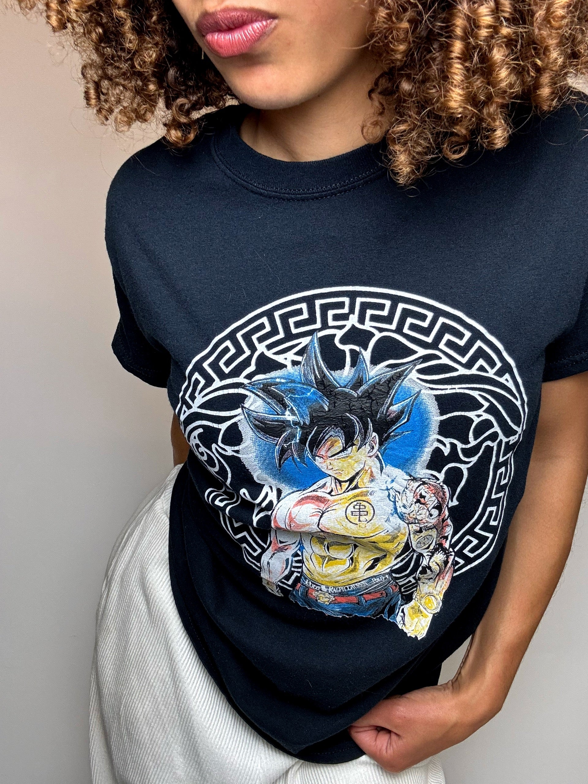 Tee-shirt noir en coton avec visuel de Son Goku, revisité dans une version ultra stylisée. Torse nu, tatoué, en pleine puissance, le héros de Dragon Ball Z s’impose sur un fond à motifs d’inspiration grecque. Un design unique qui mêle manga culte et esthétique street, pour un look audacieux et graphique.