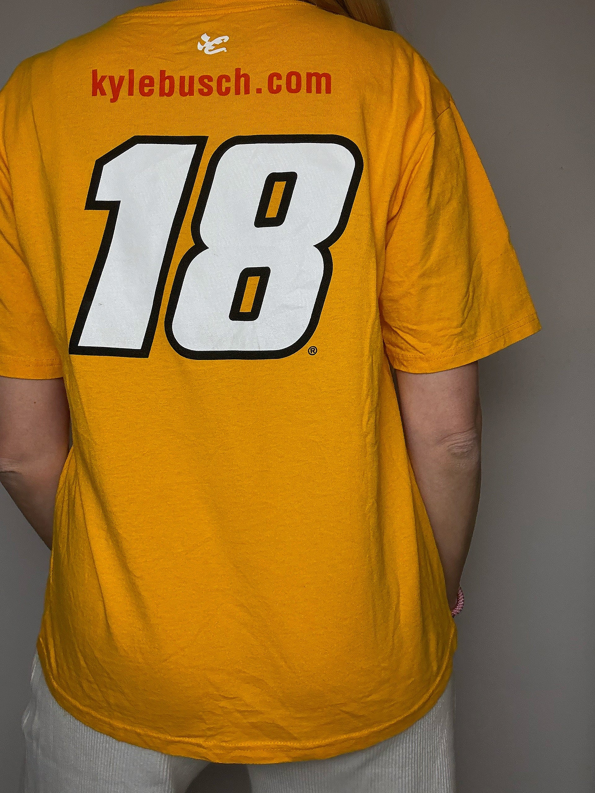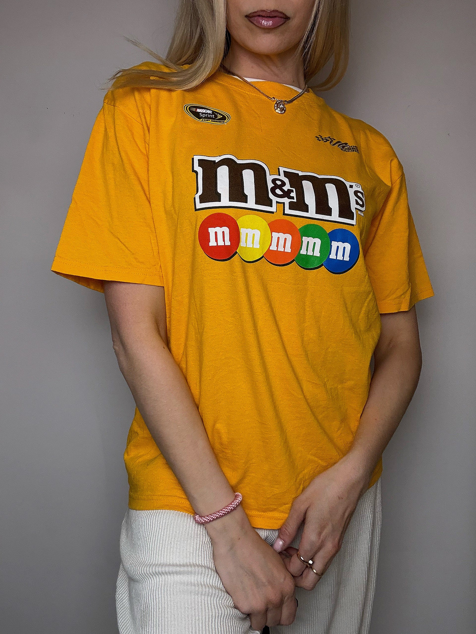 Ce t-shirt est clairement un merch officiel NASCAR lié au pilote Kyle Busch, l’un des plus connus de la discipline. Il faisait partie de l’écurie Joe Gibbs Racing et conduisait la voiture n°18 sponsorisée par M&M's, d'où le gros logo coloré.