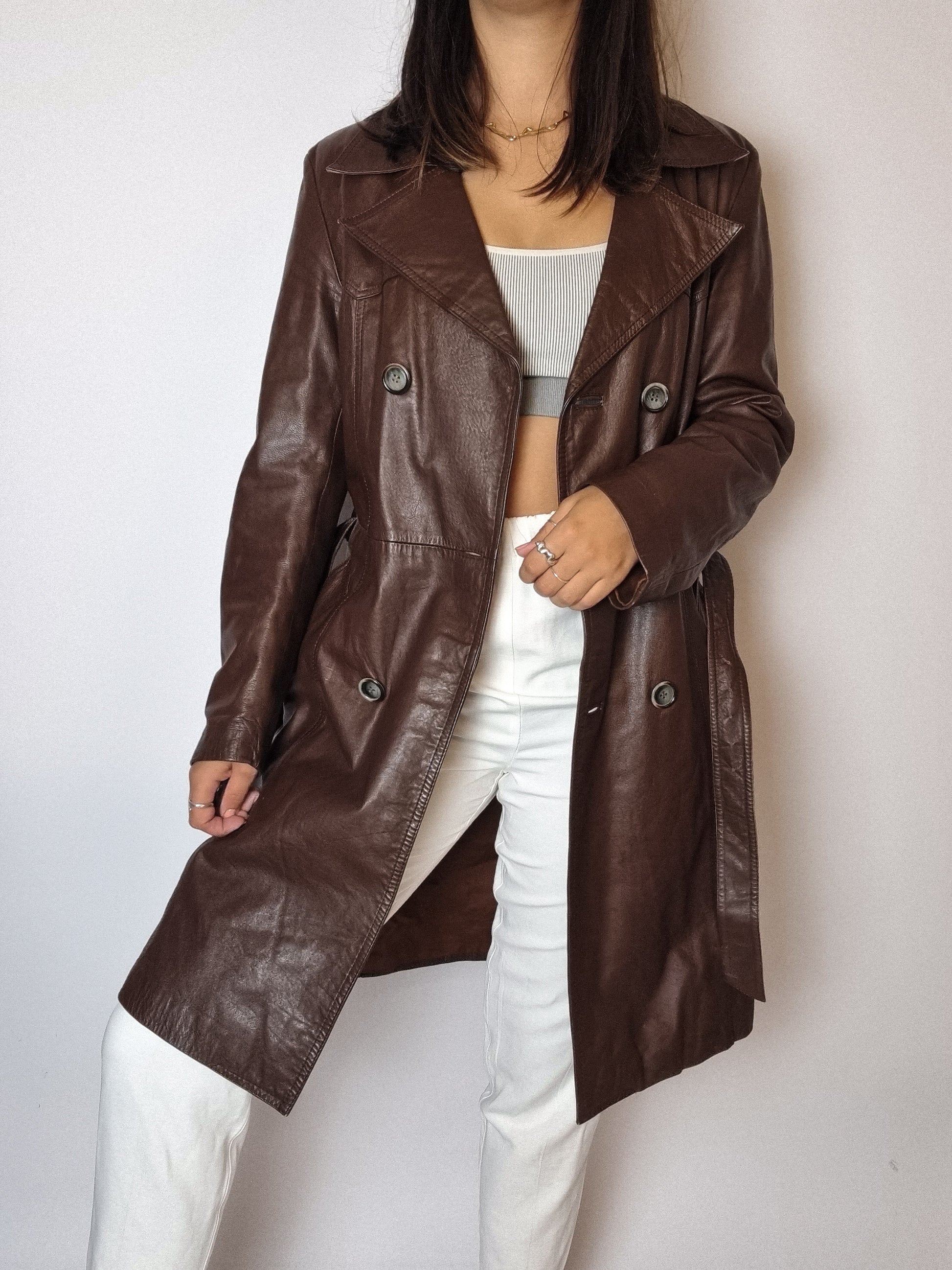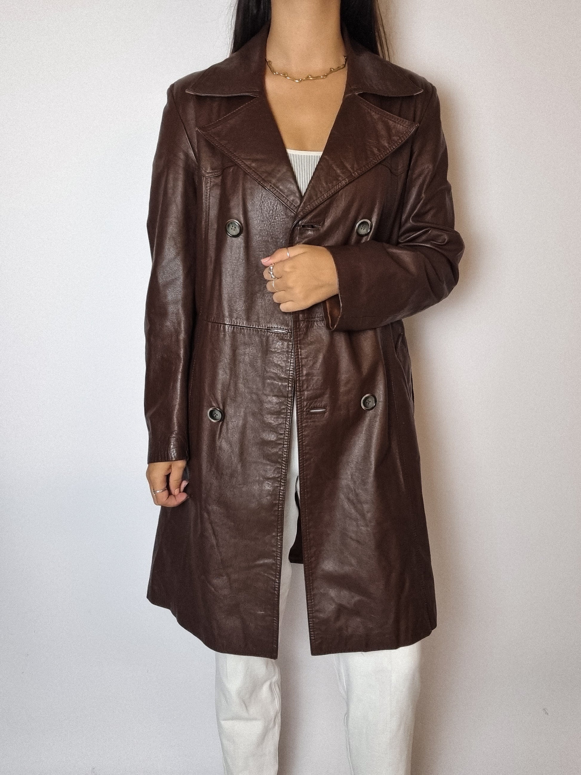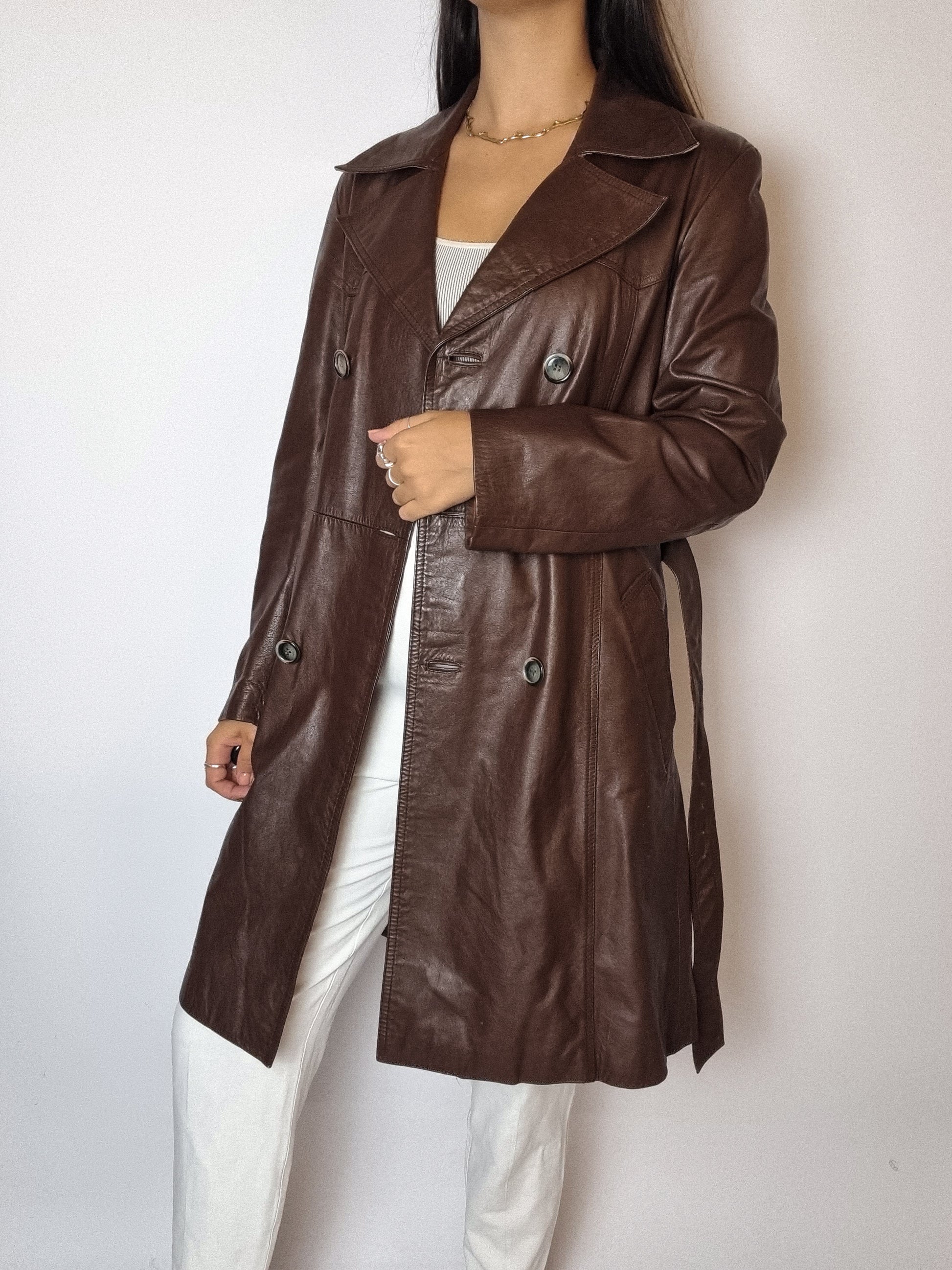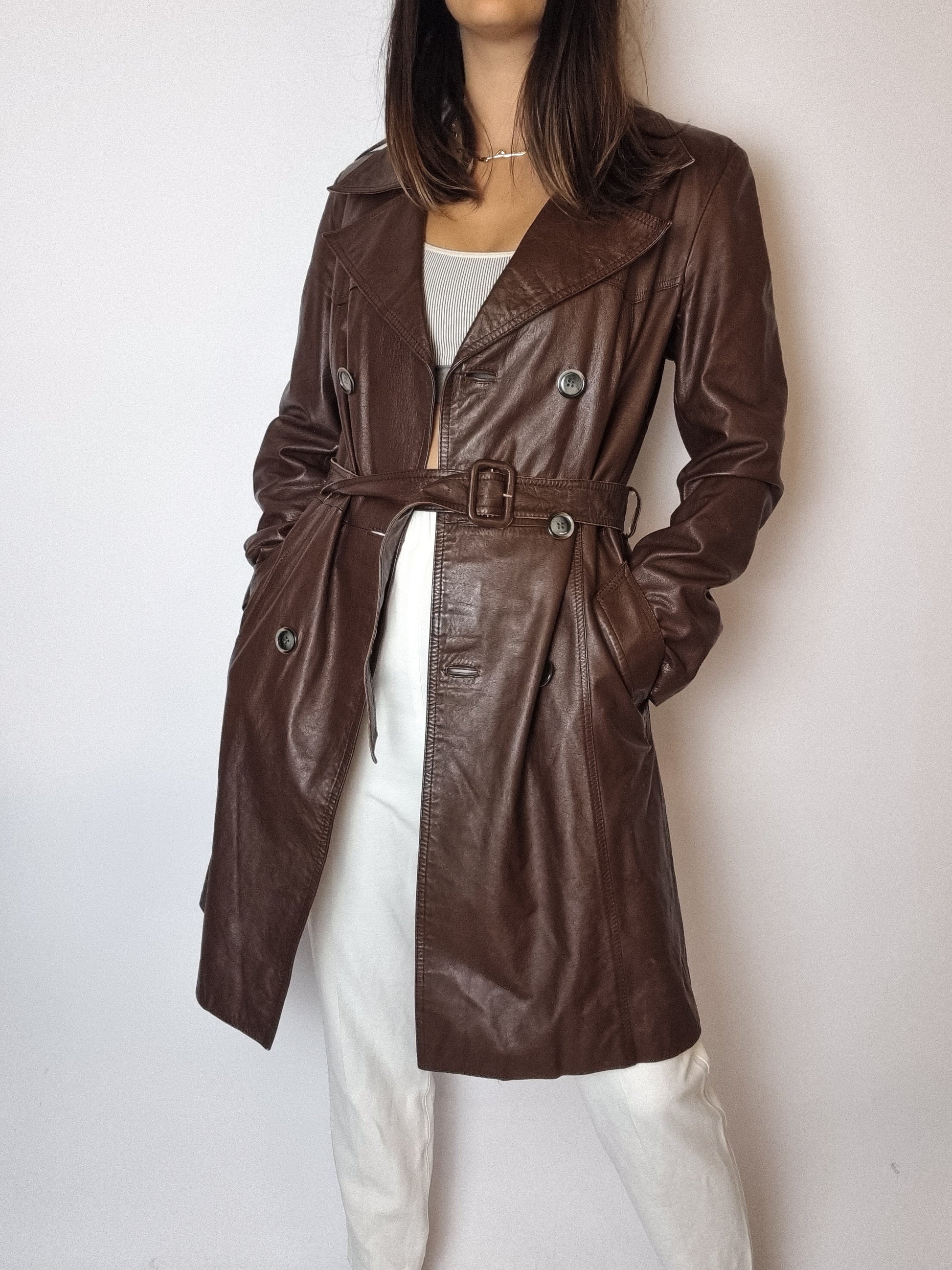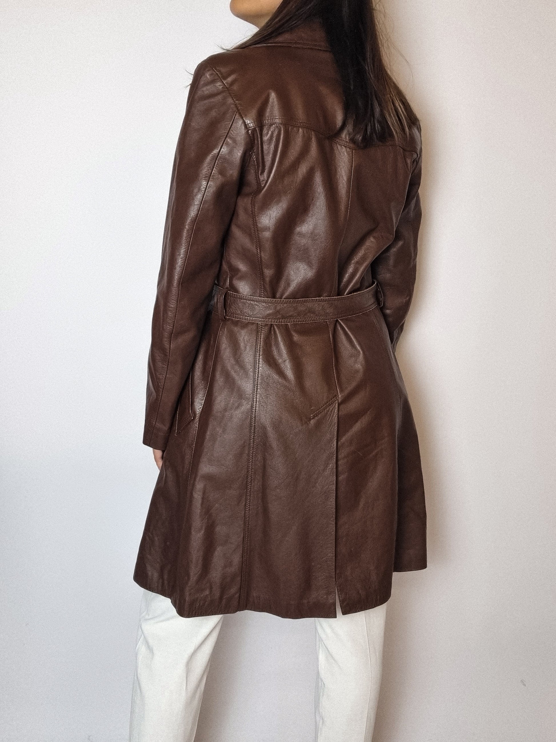 Trenchcoat en cuir brun vintage S/M