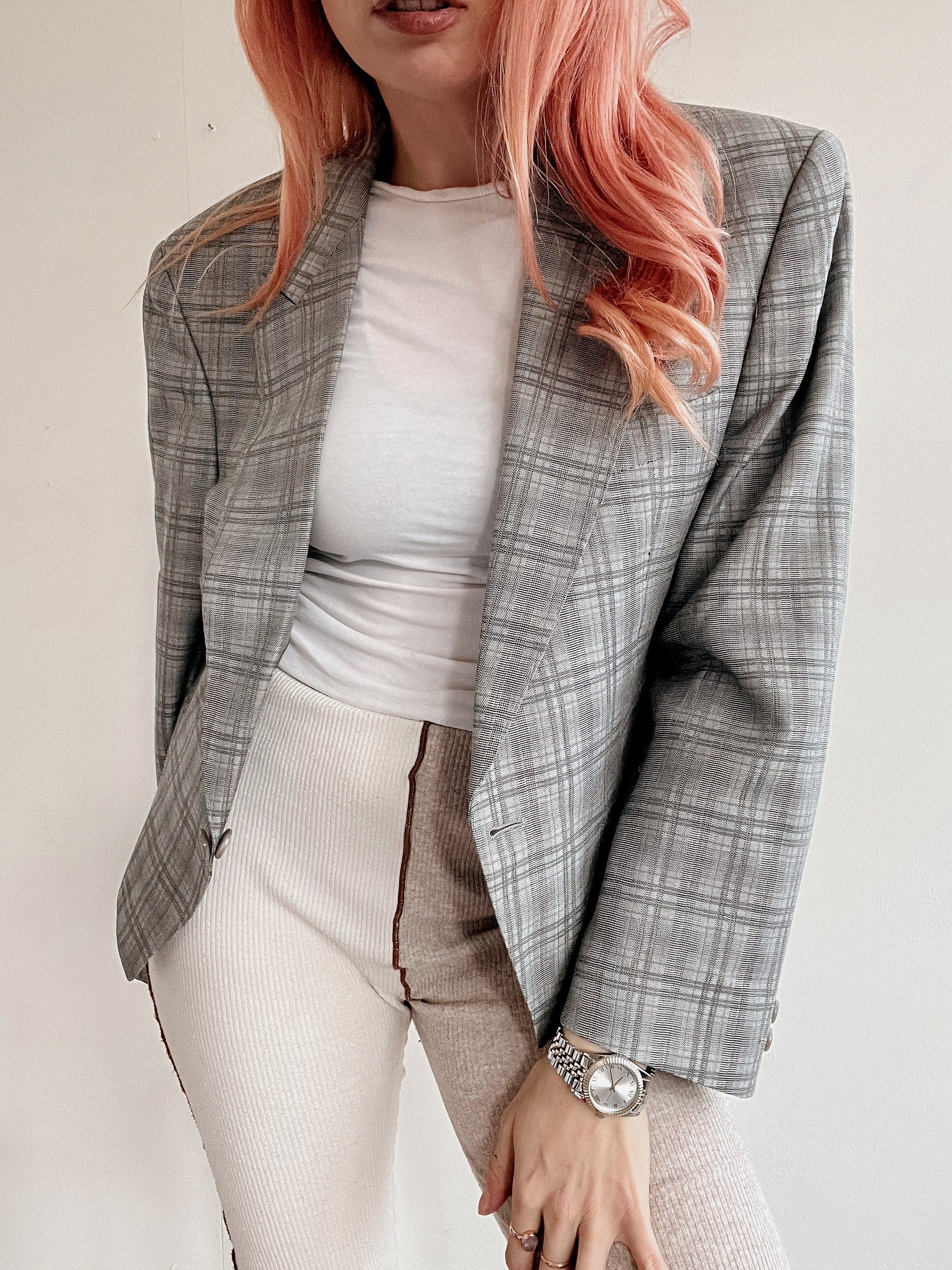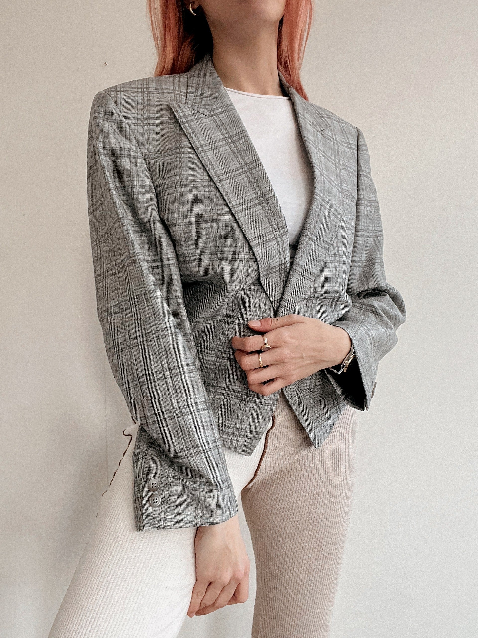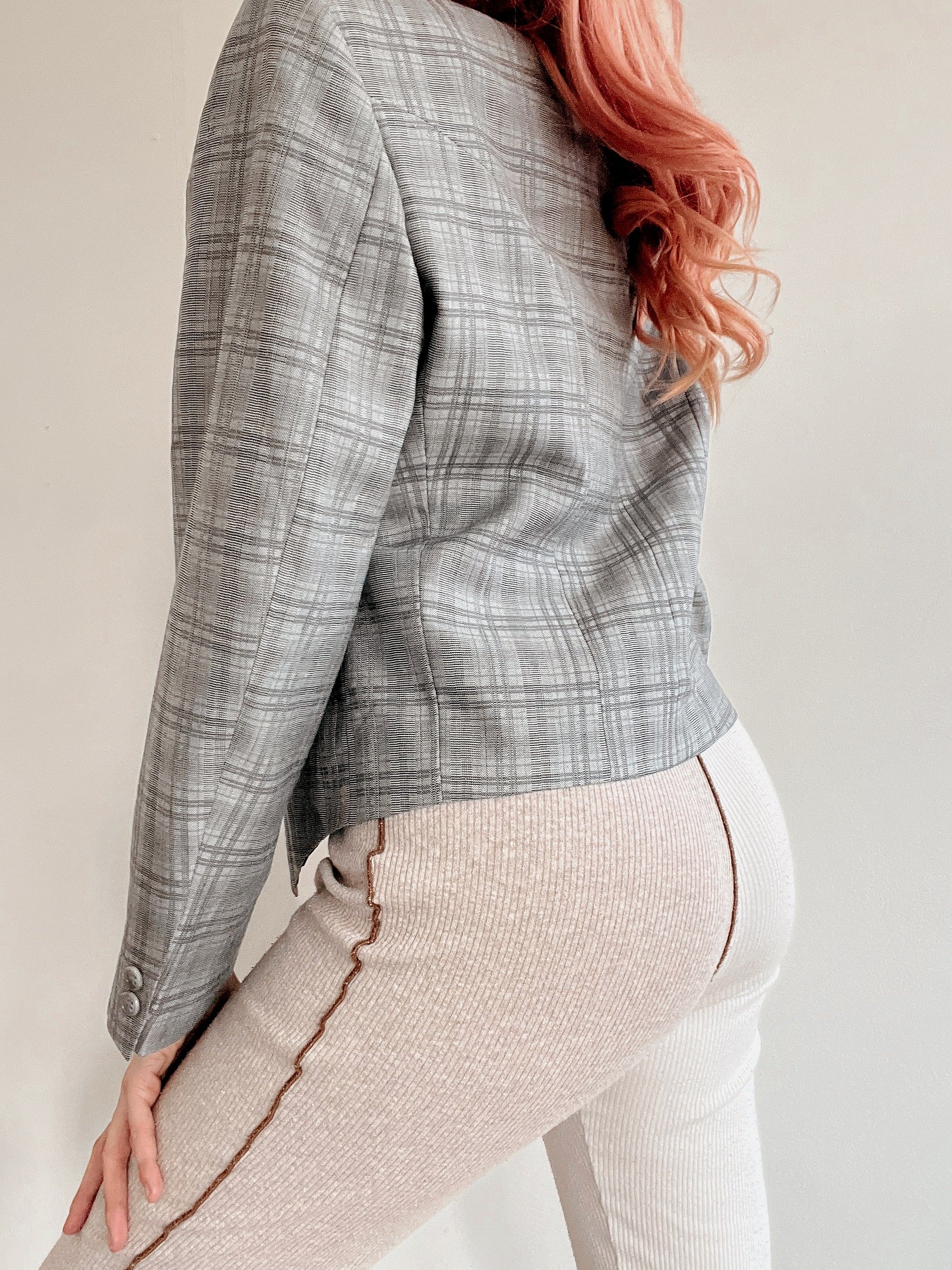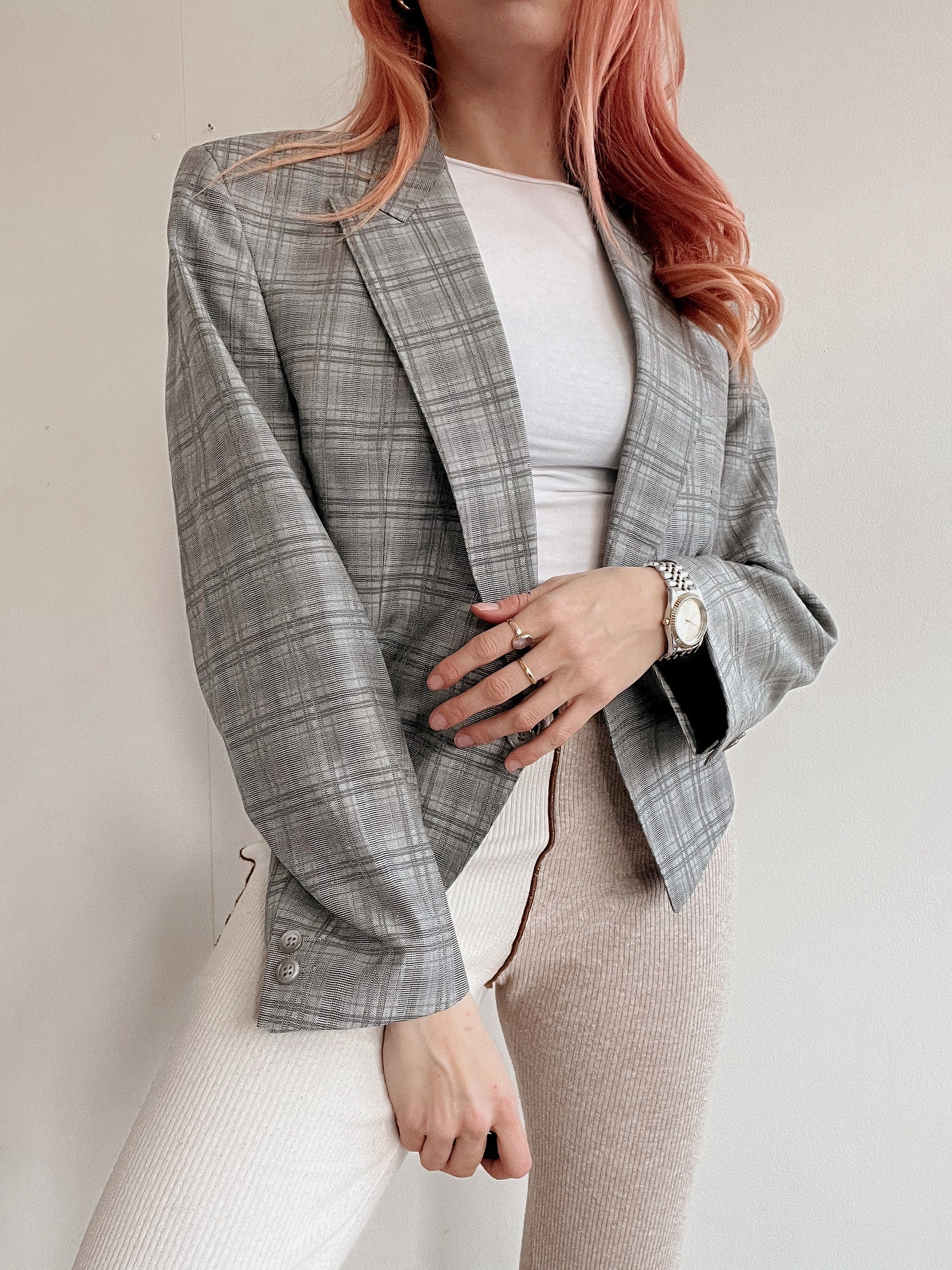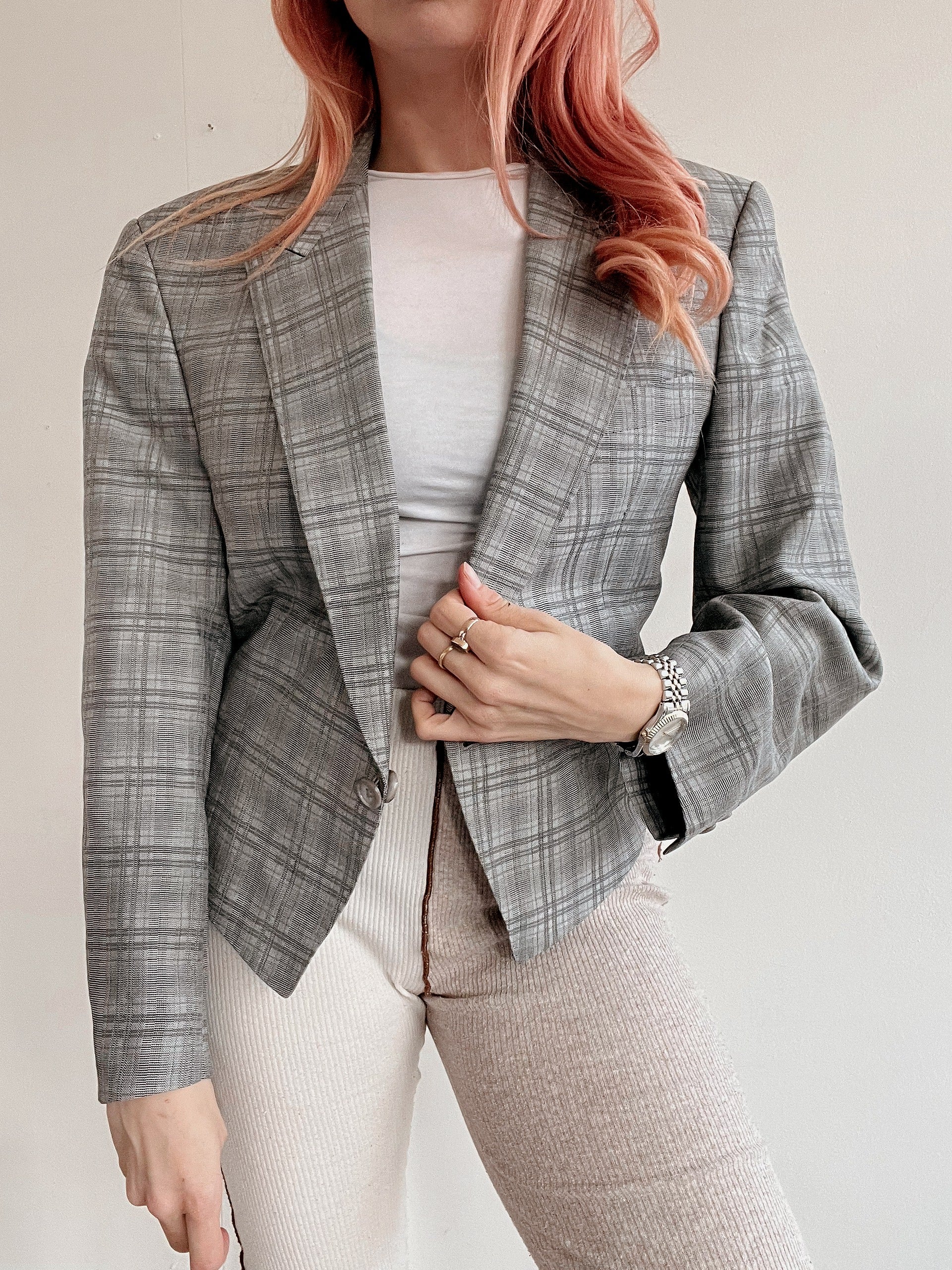 Veste blazer vintage fine grise à carreaux coupe courte S/M
