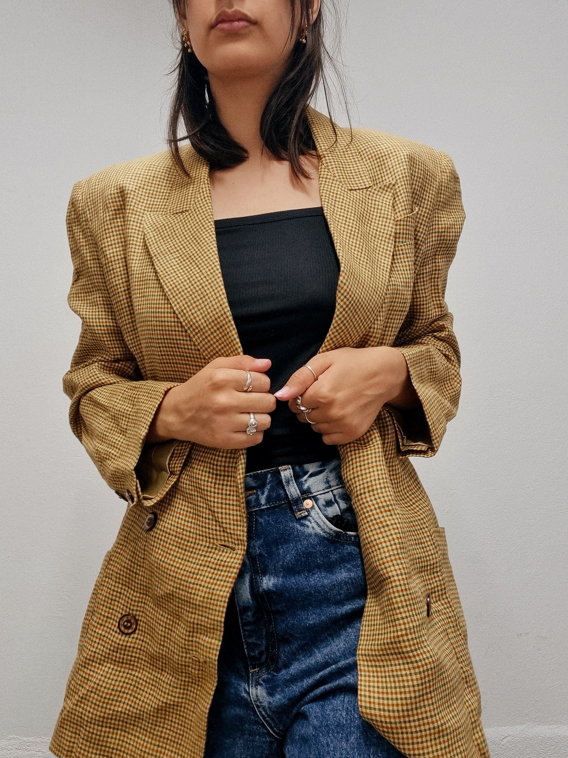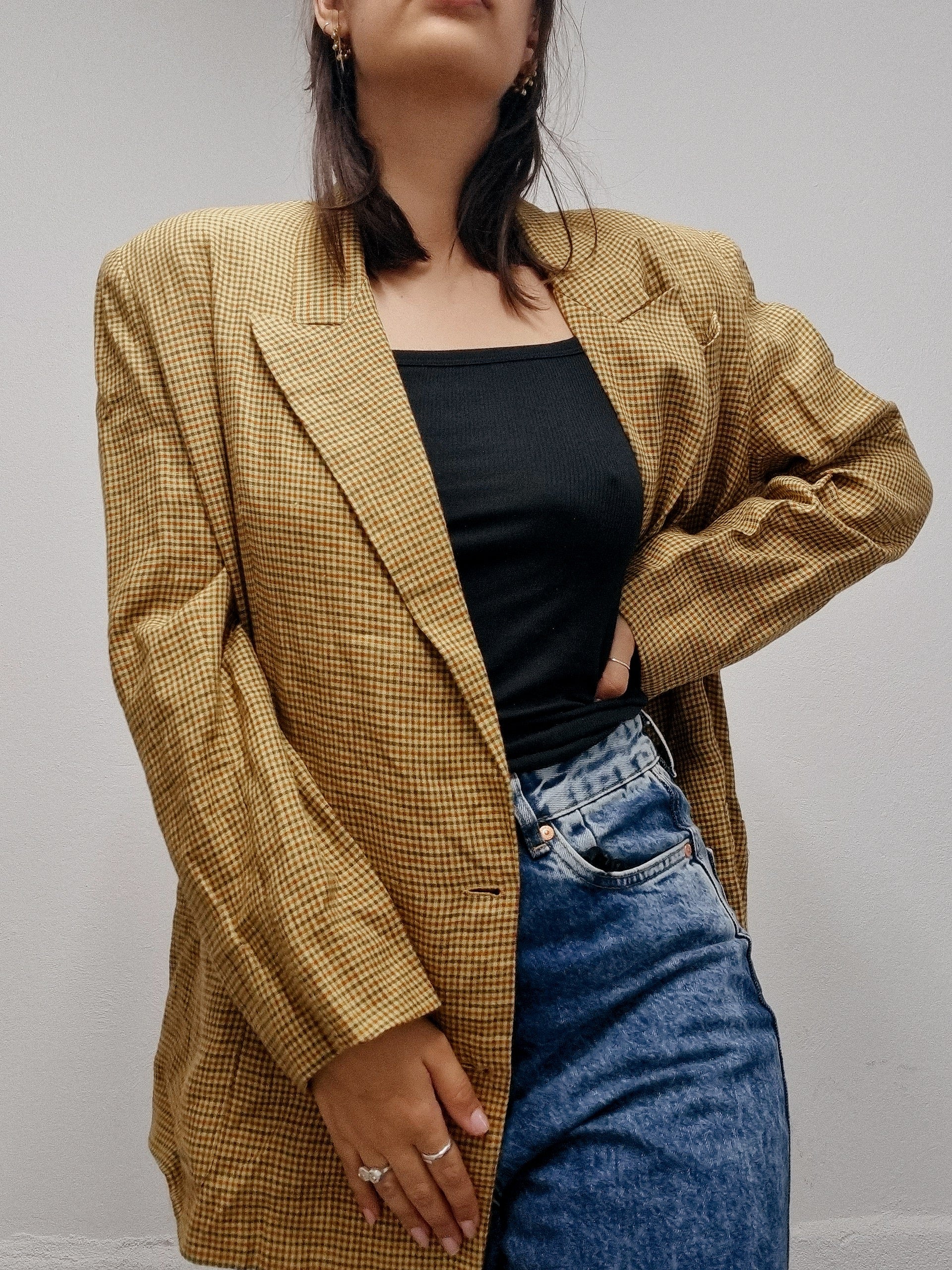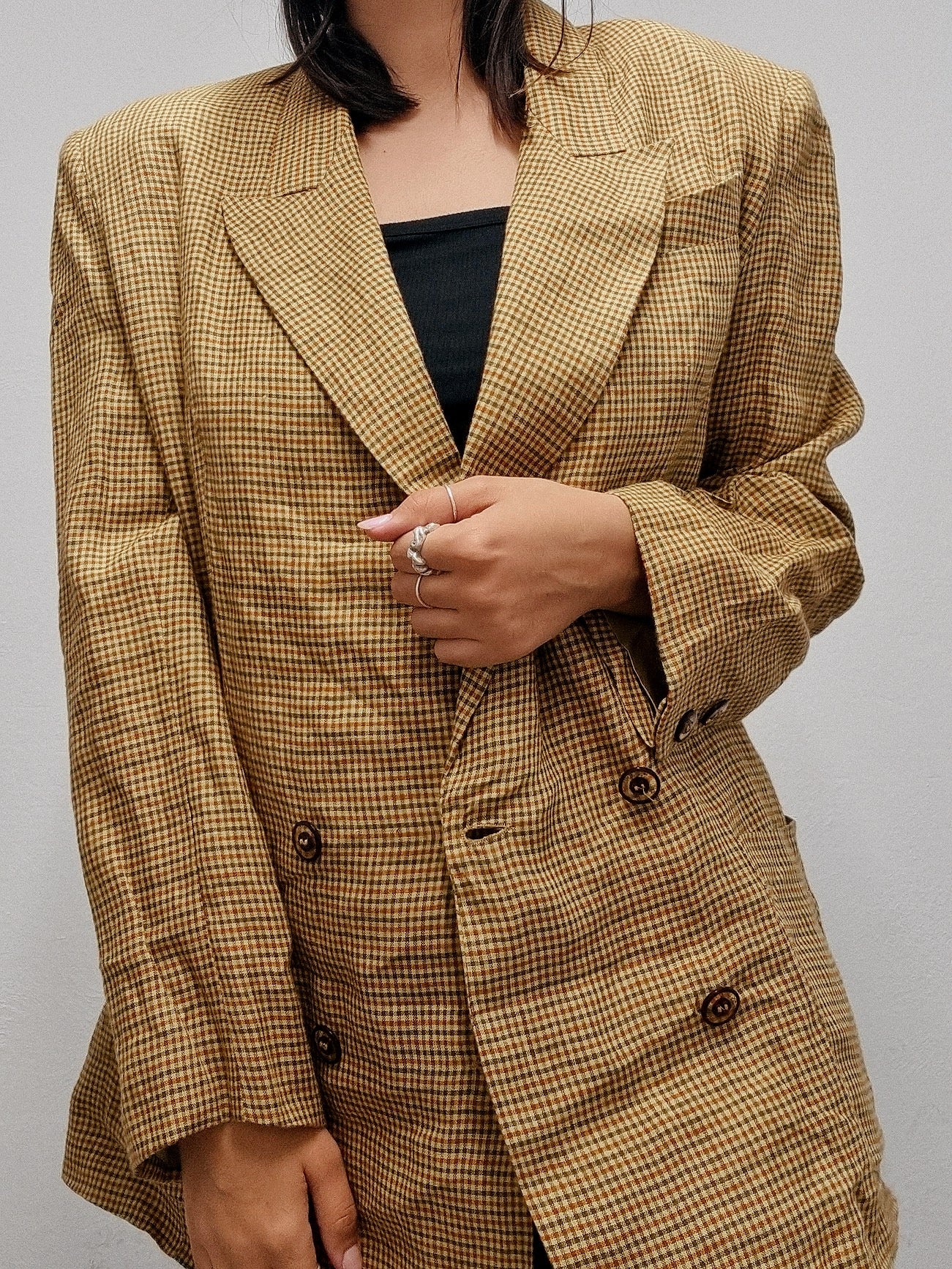 Veste blazer vintage oversized beige/moutarde à carreaux L