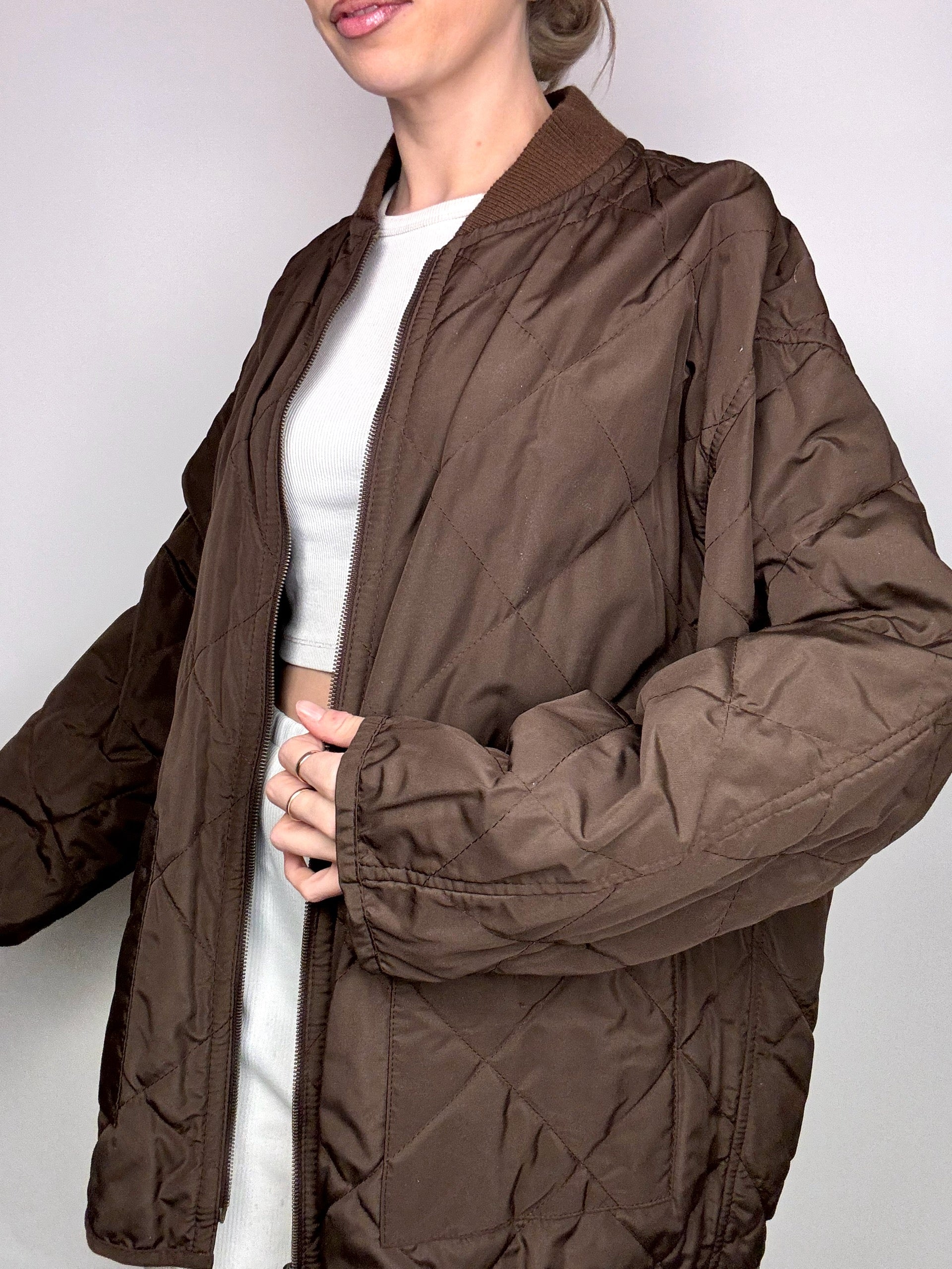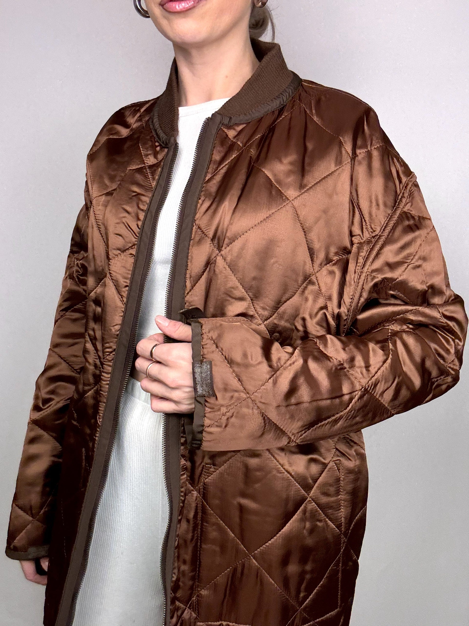 - Puis tu peux facilement enlever la doublure et la surprise ! un bomber matelassé marron brillant ! Tu pourras le porter en mi saison ou même sous un autre manteau !