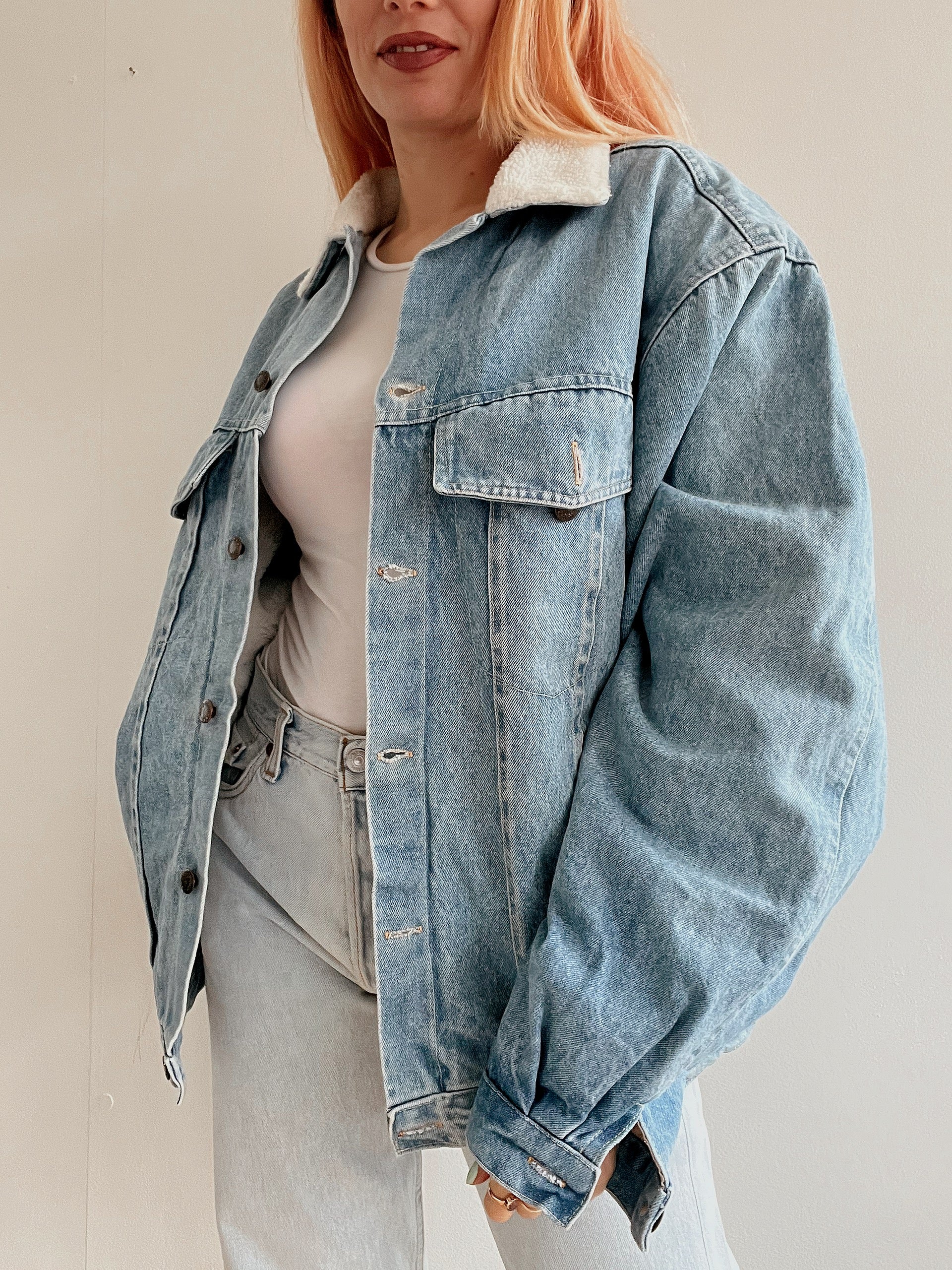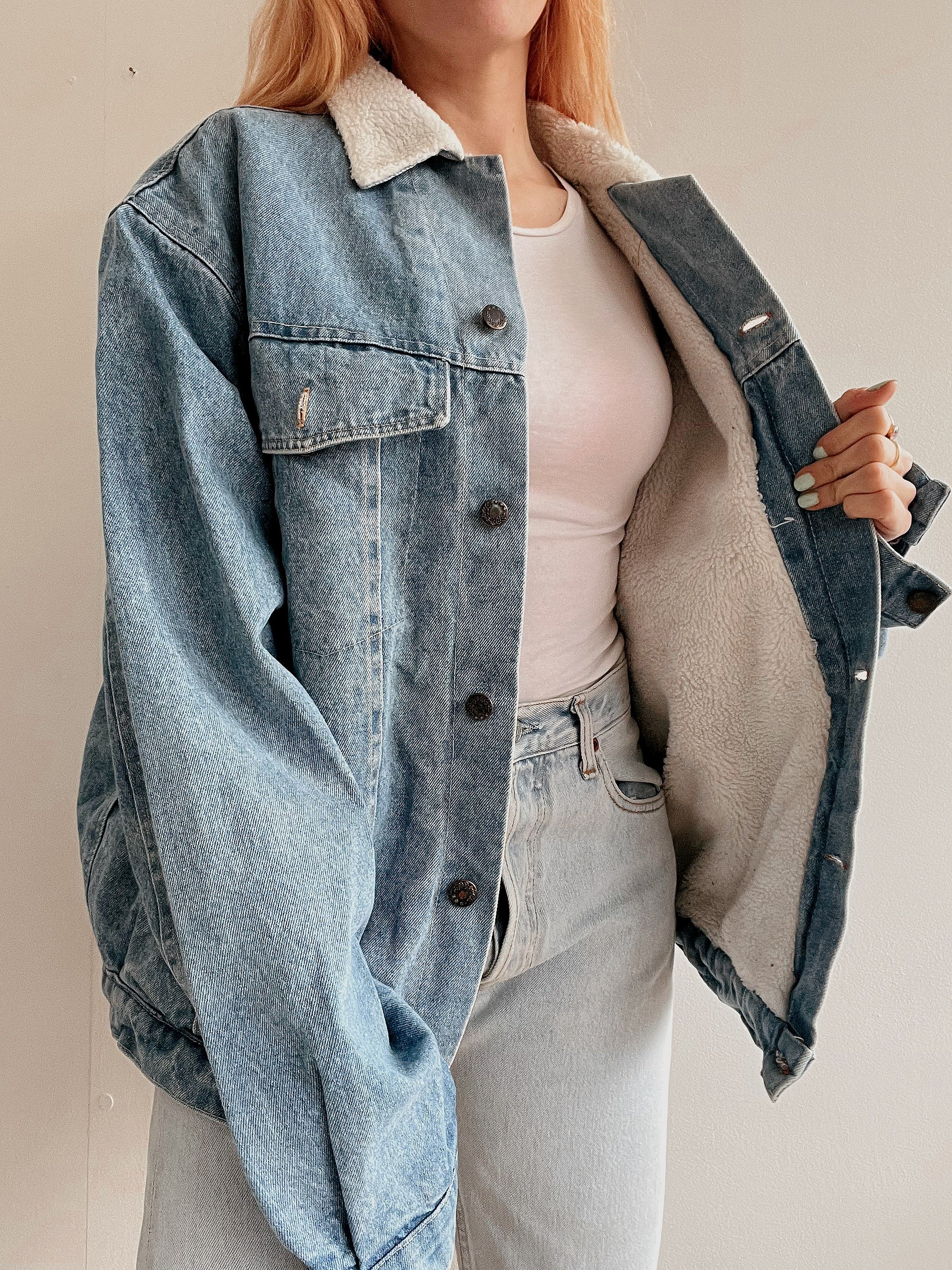 Veste en jeans vintage bleue claire avec intérieur mouton XL