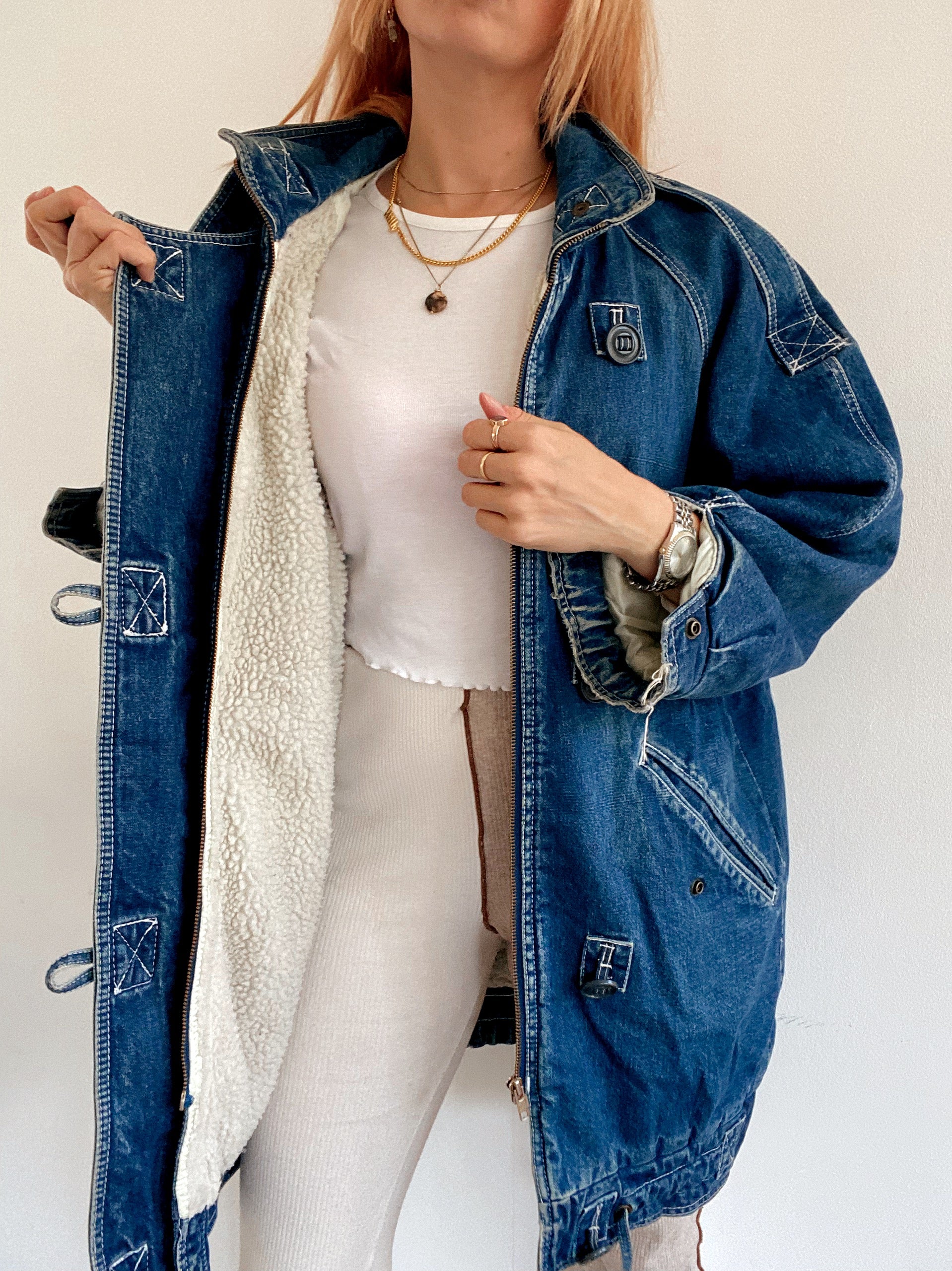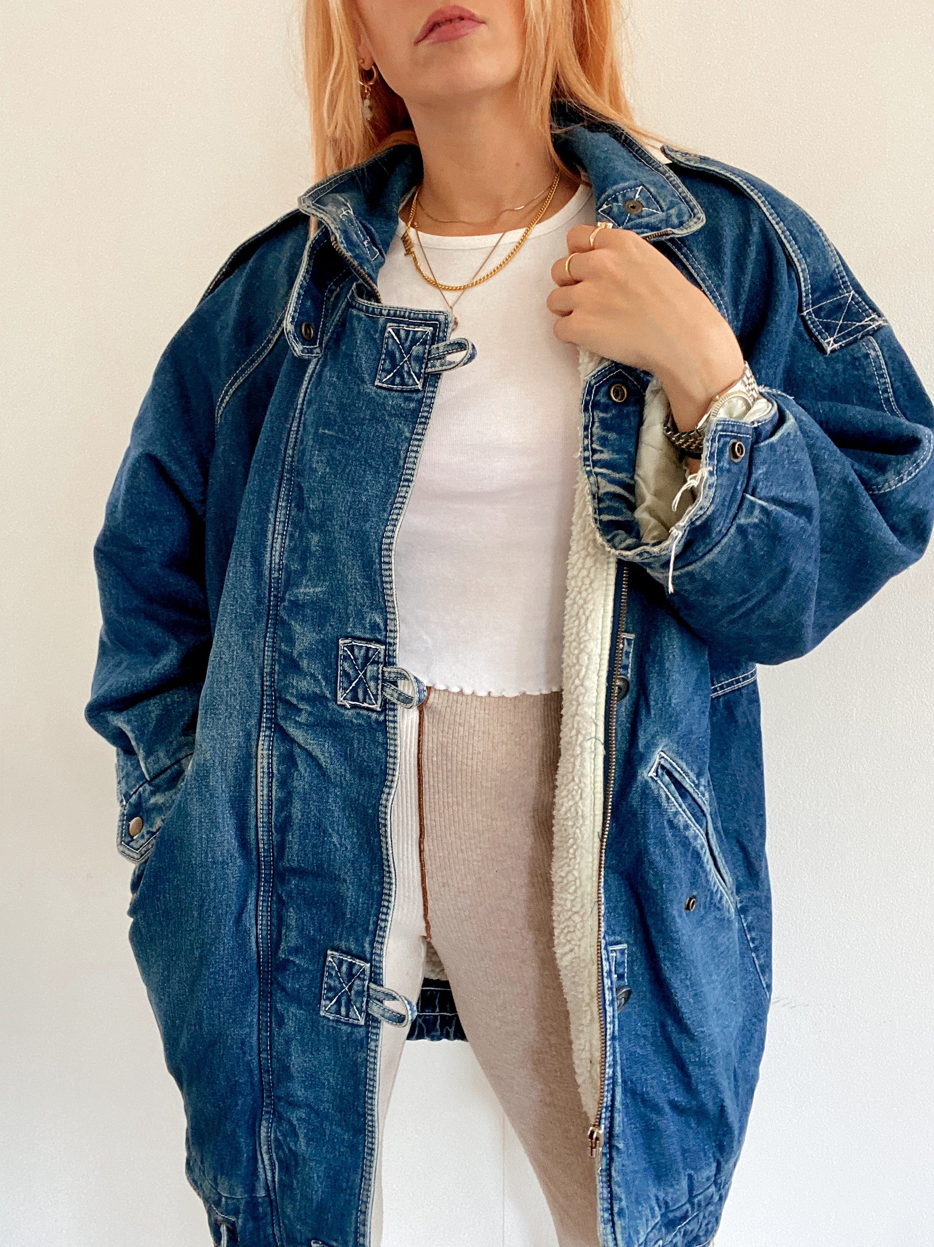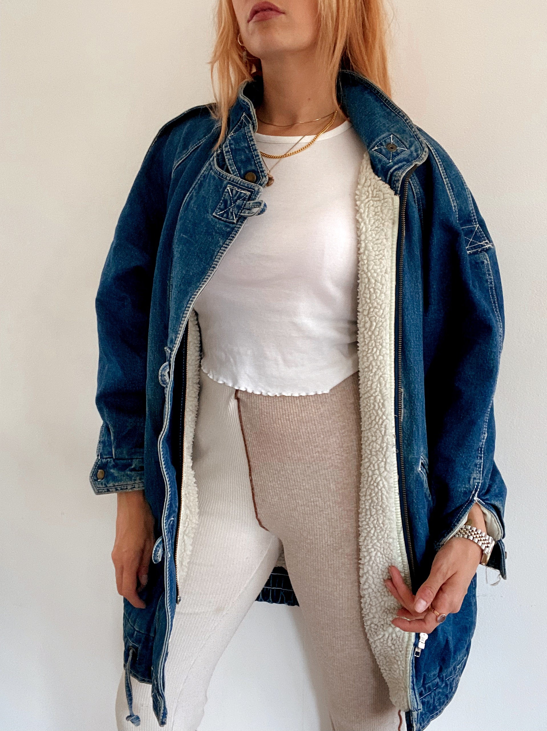 Veste en jeans vintage mi-longue oversized intérieur mouton M