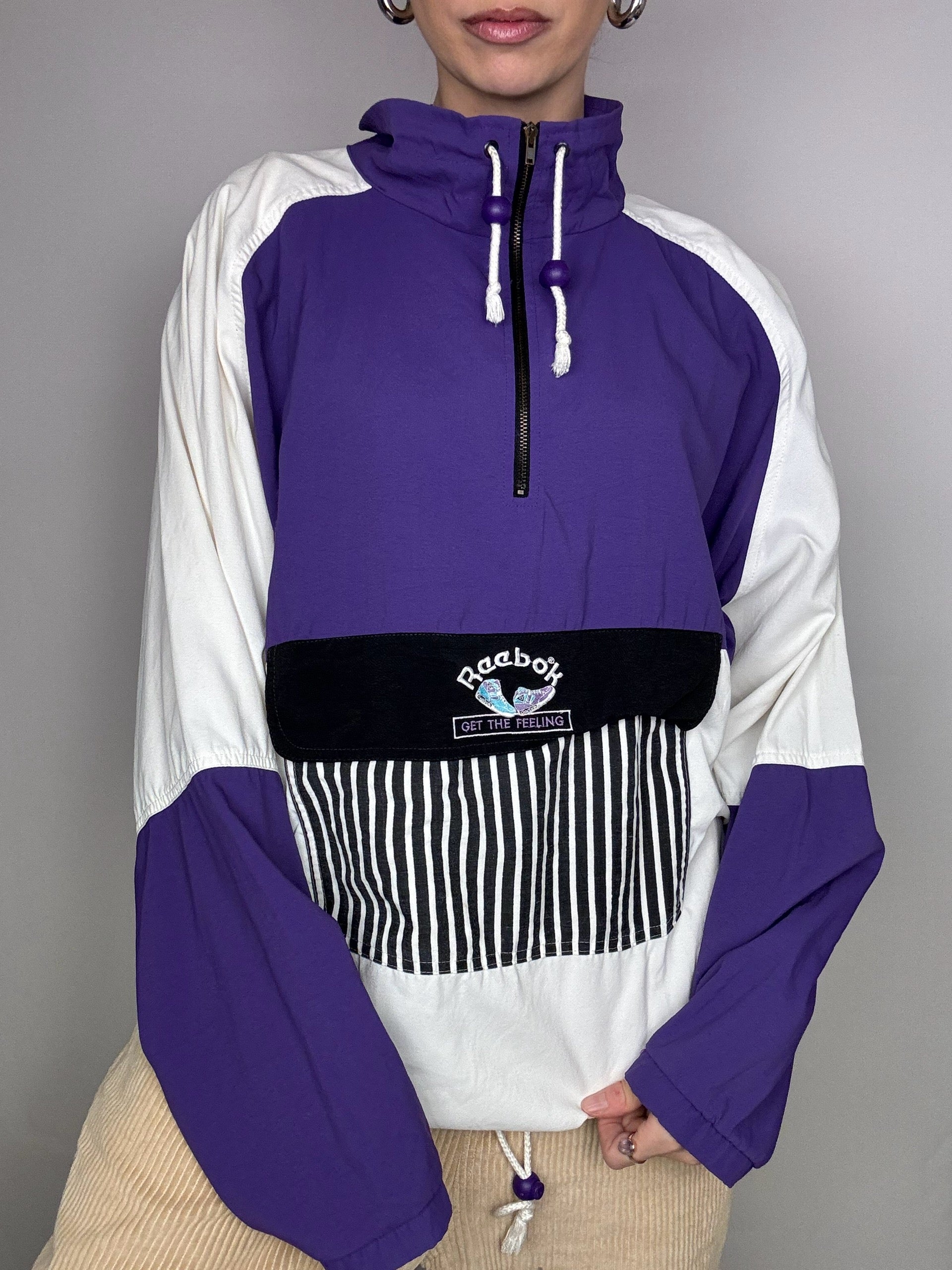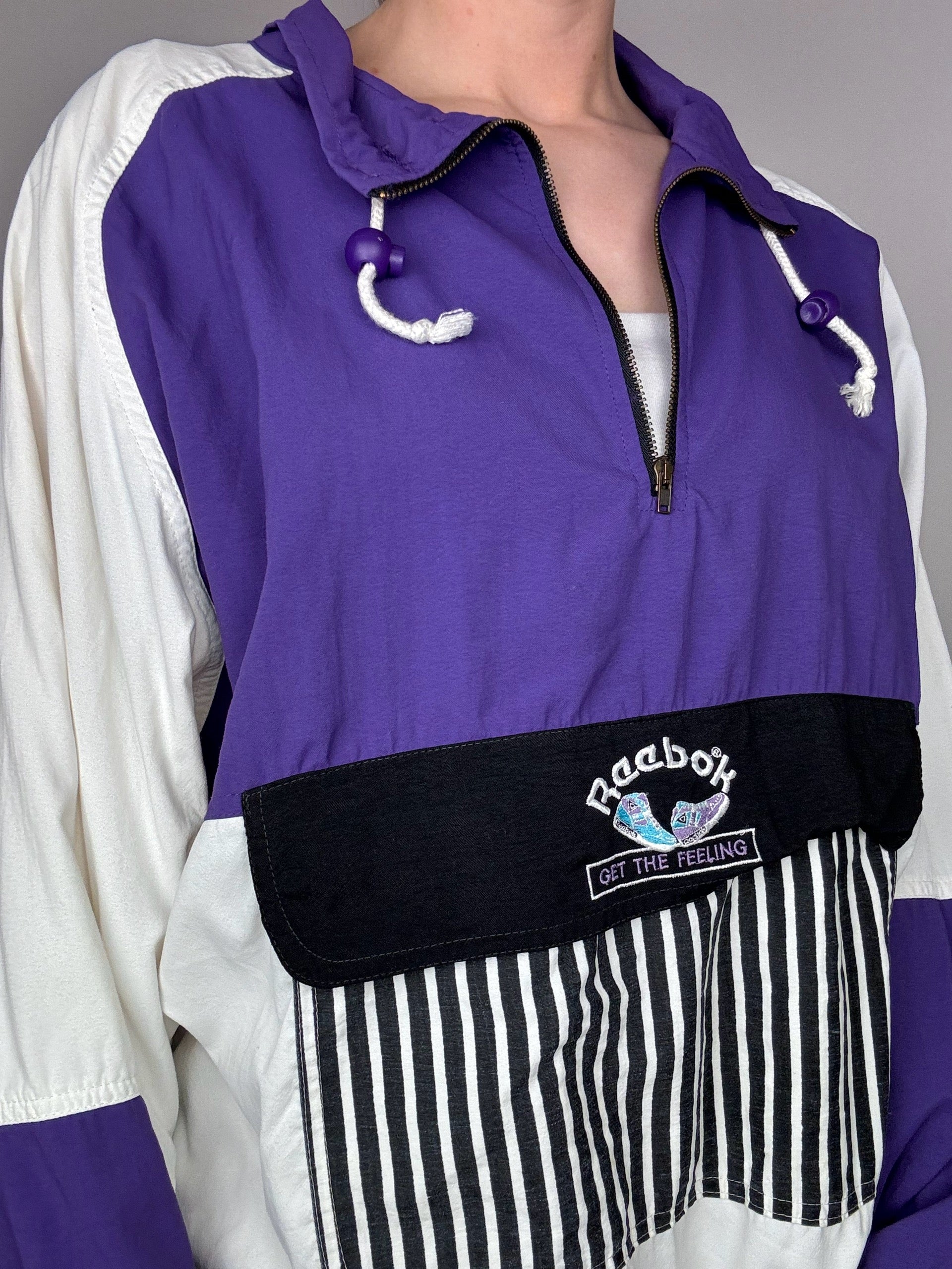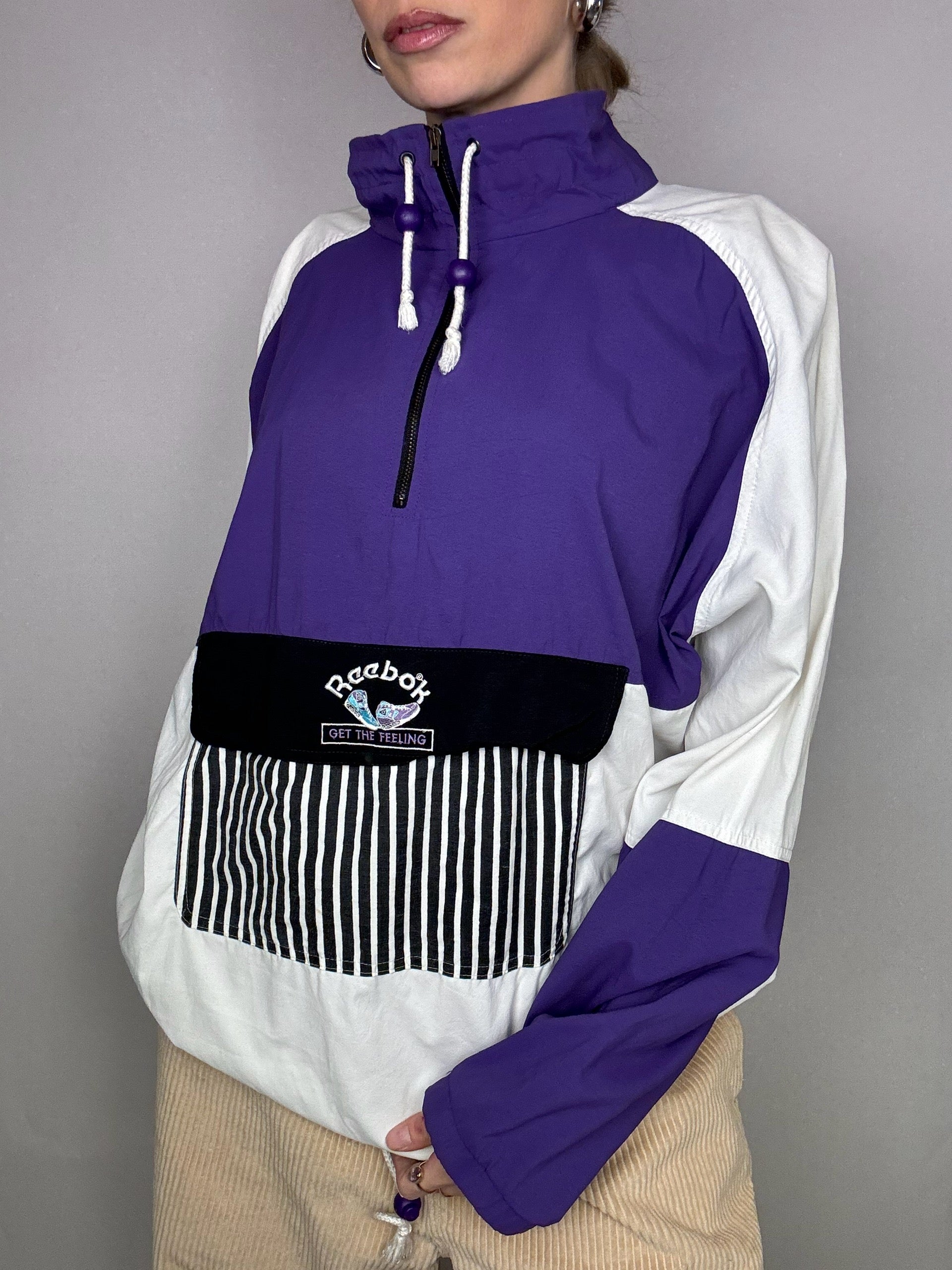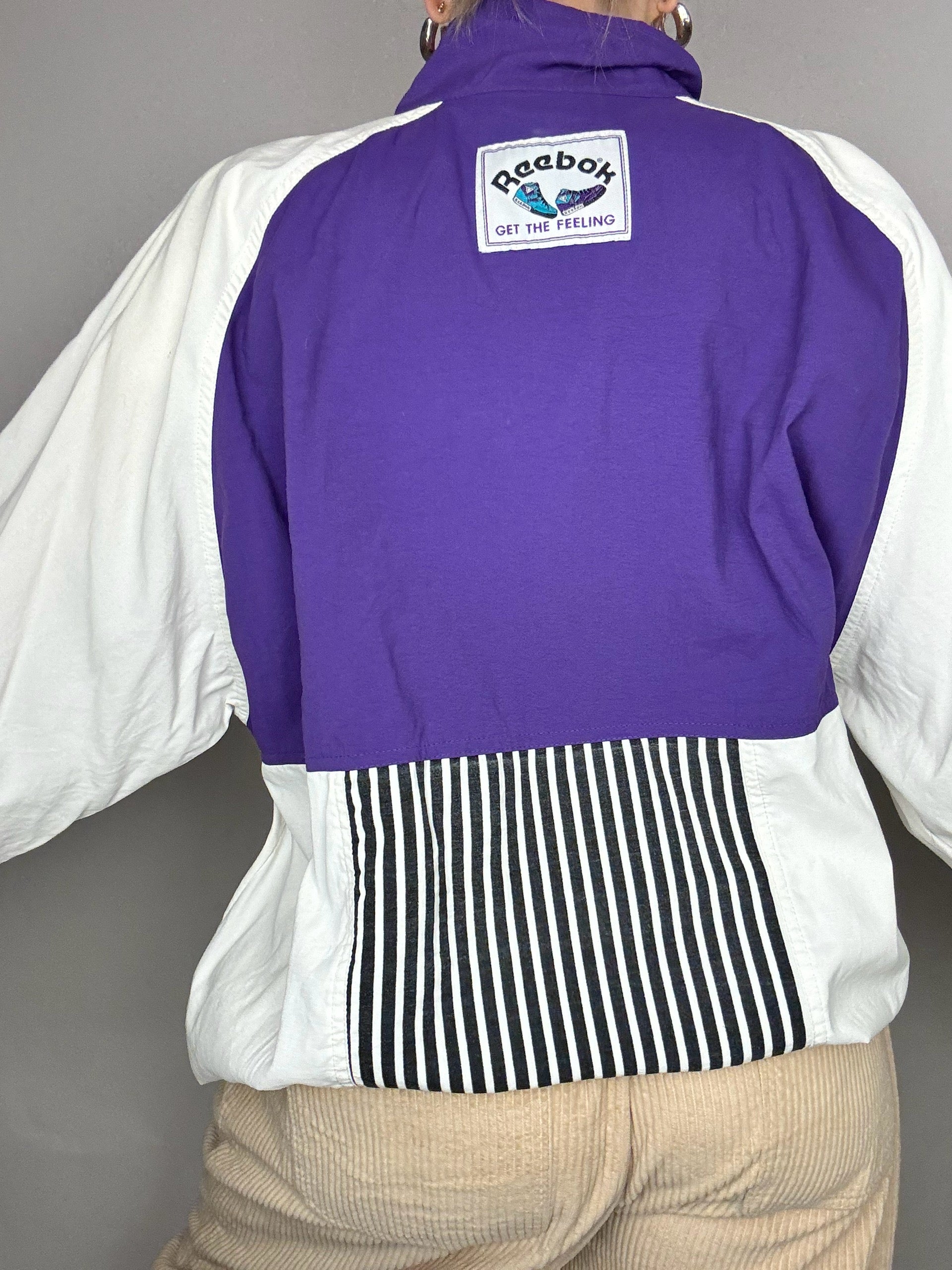 On adore le fait que cette veste s'enfile par le coup, le gros logo REEBOK bien vintage, l'étiquette au dos.