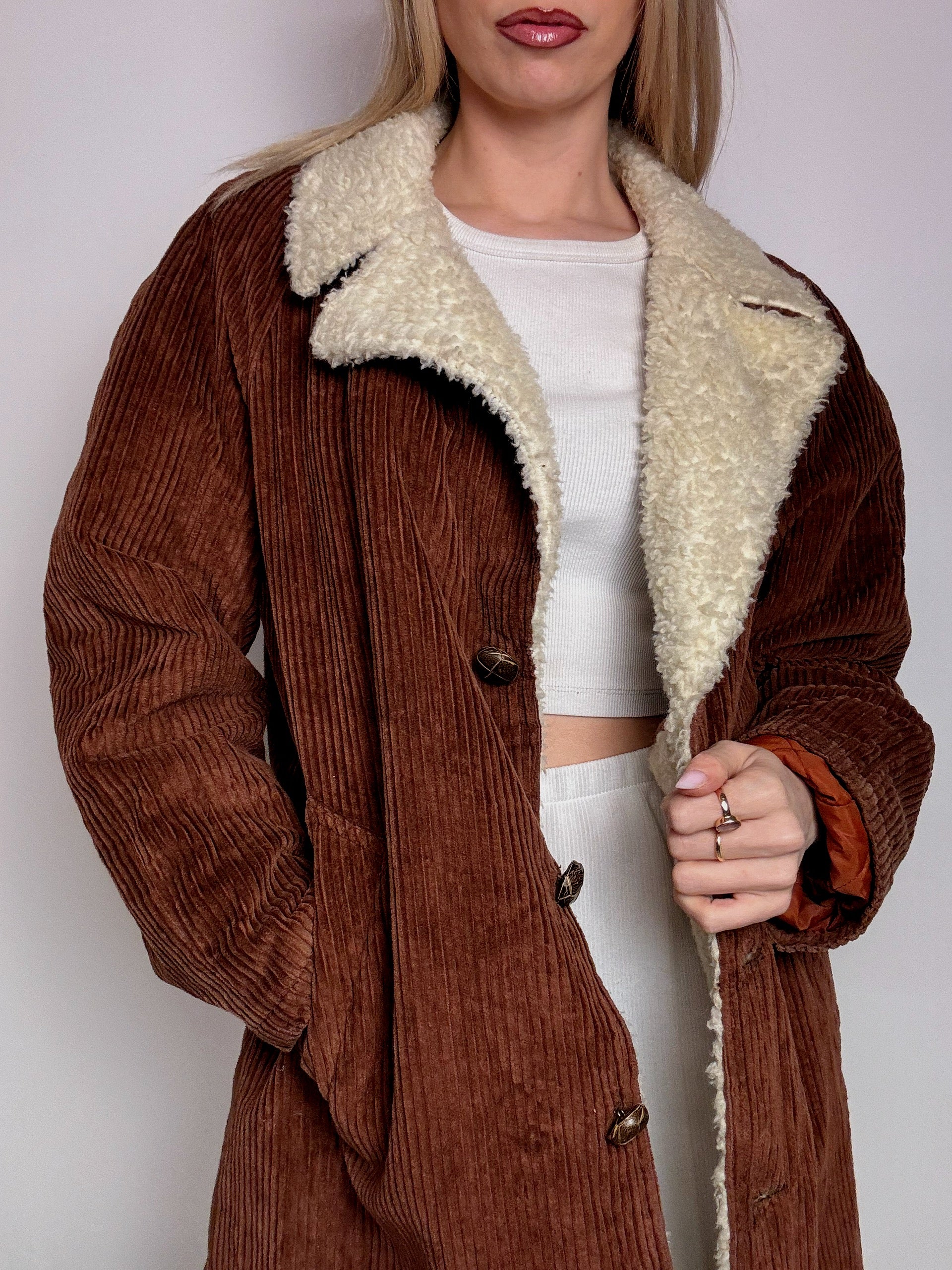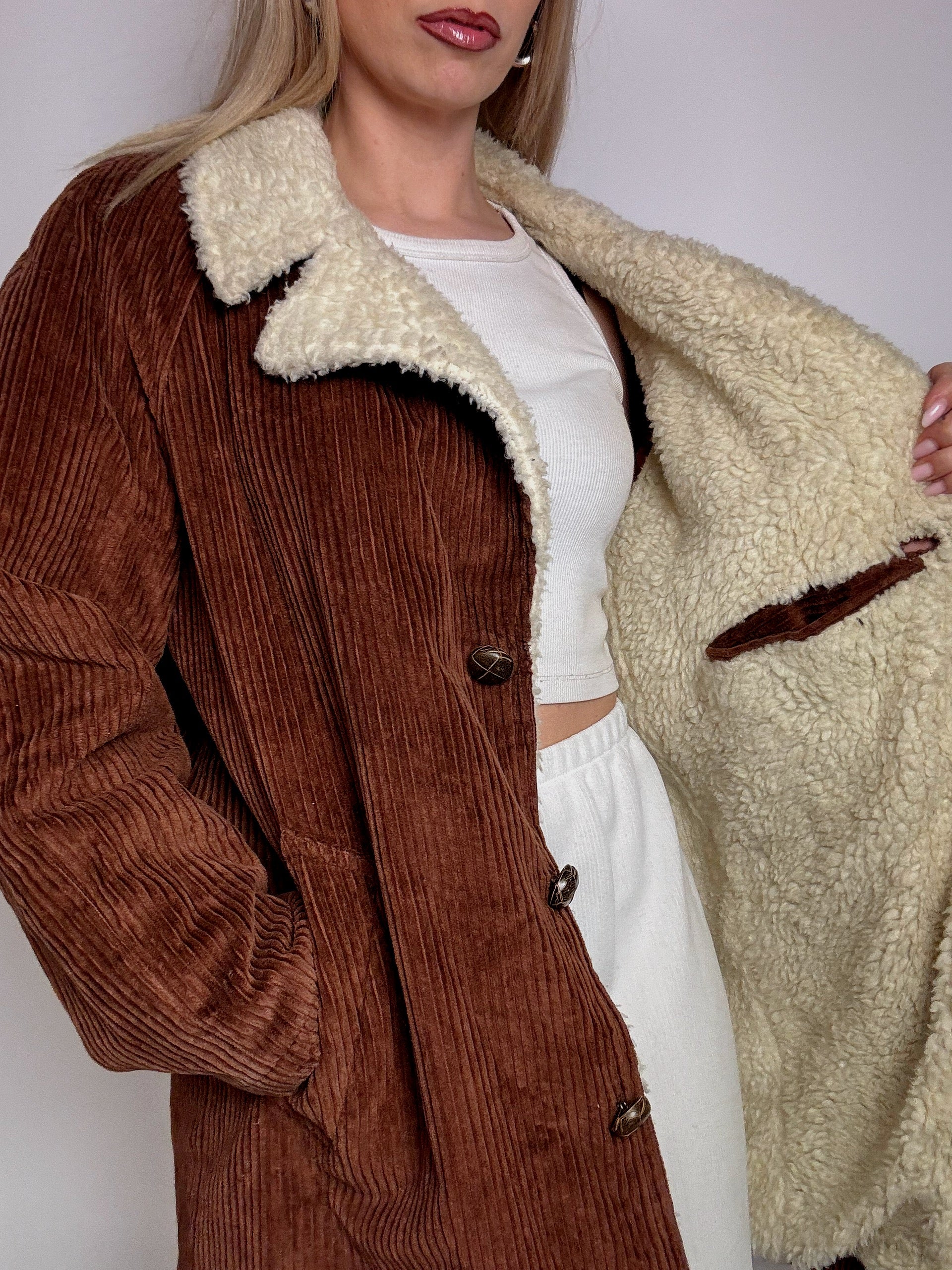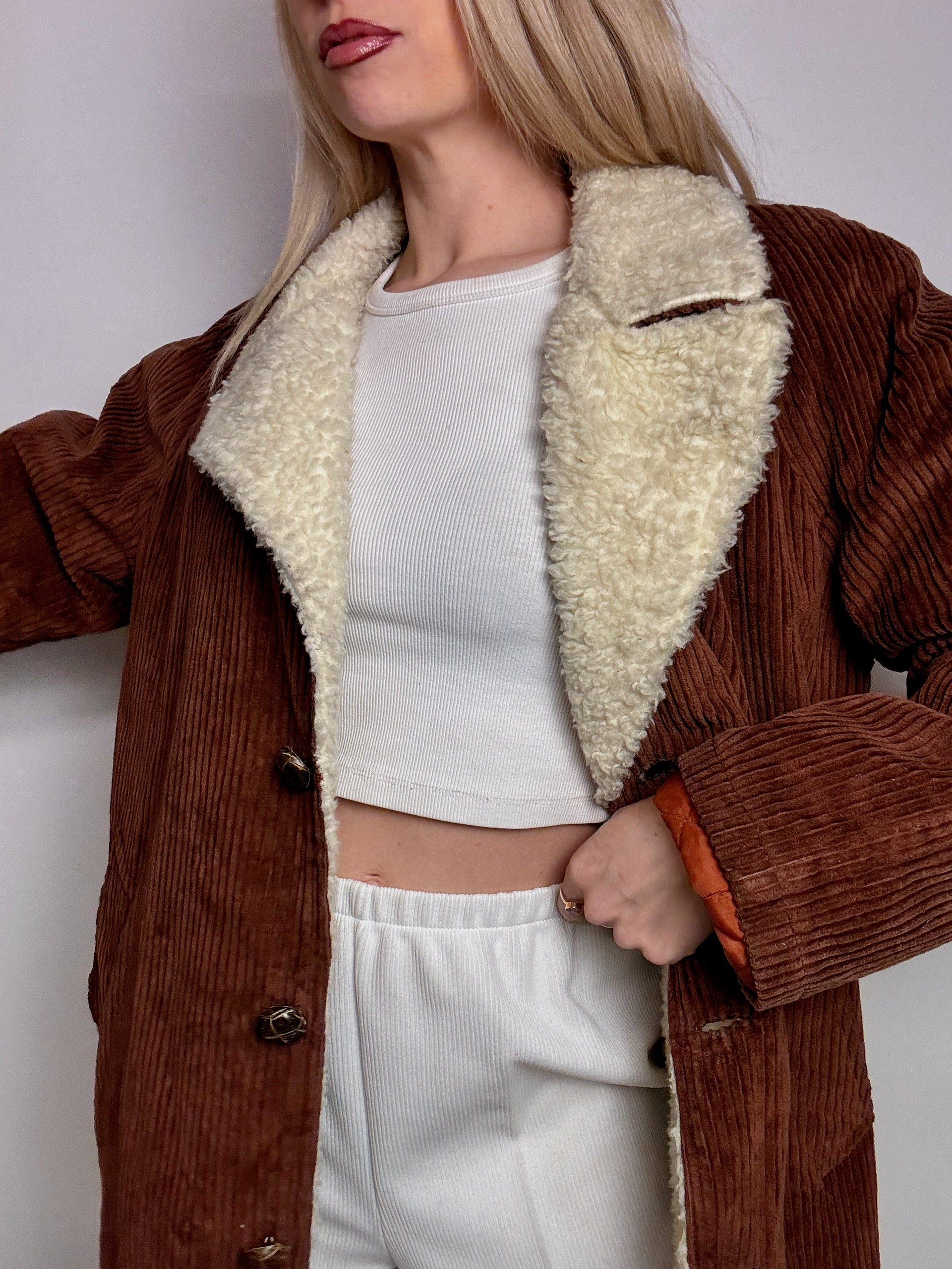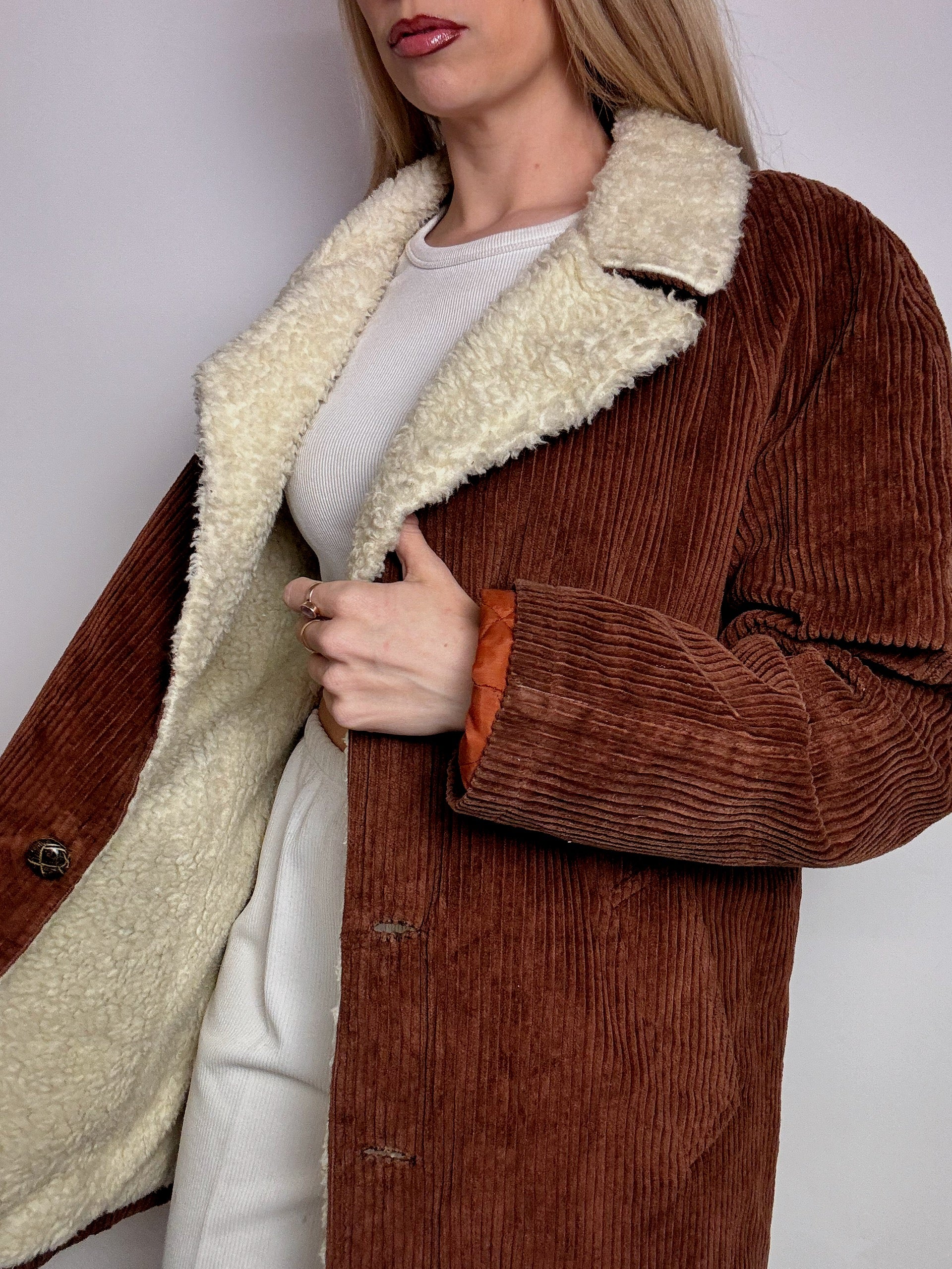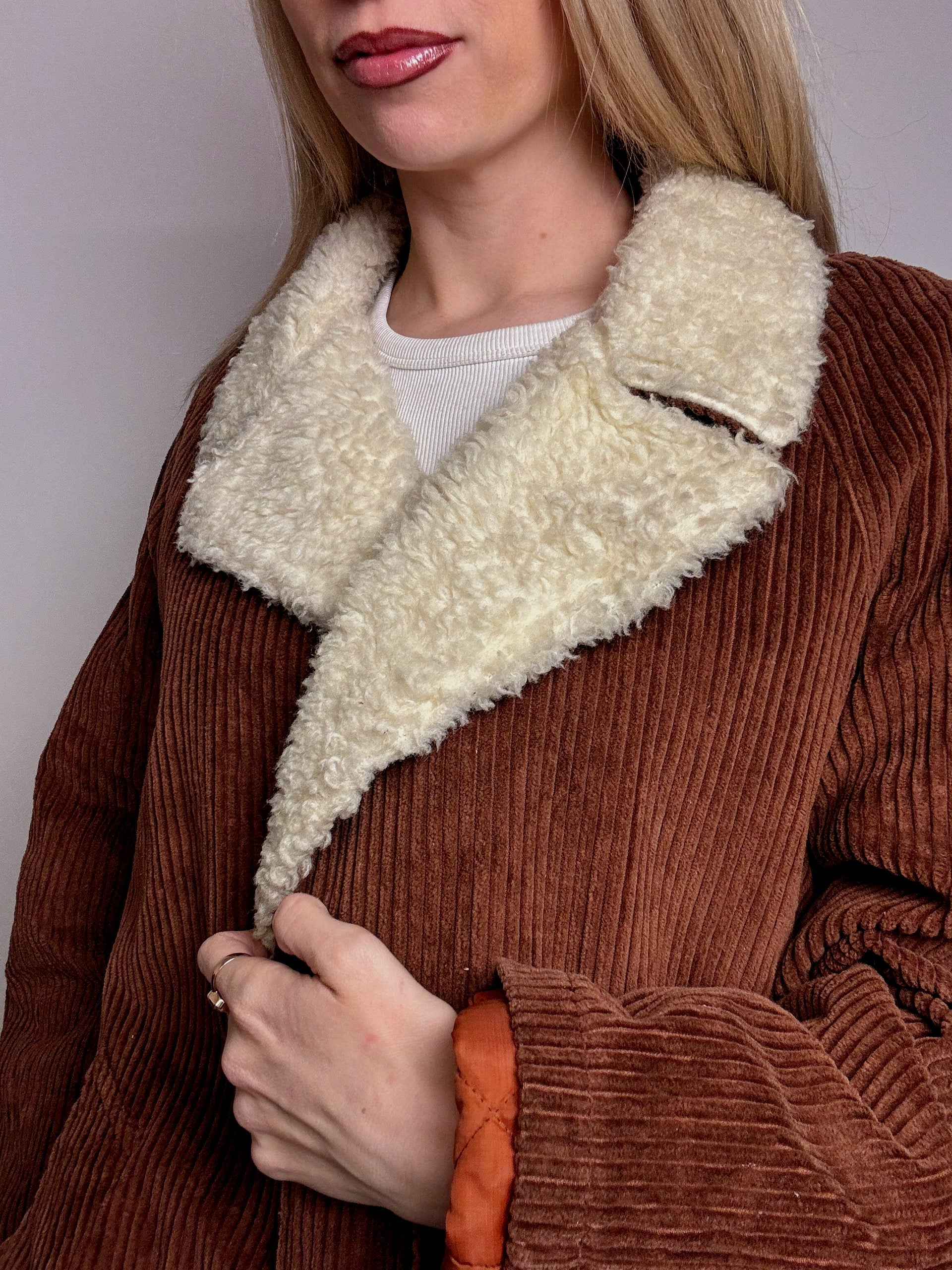Veste en velour cotelé rouille interieur bouclette L vintage