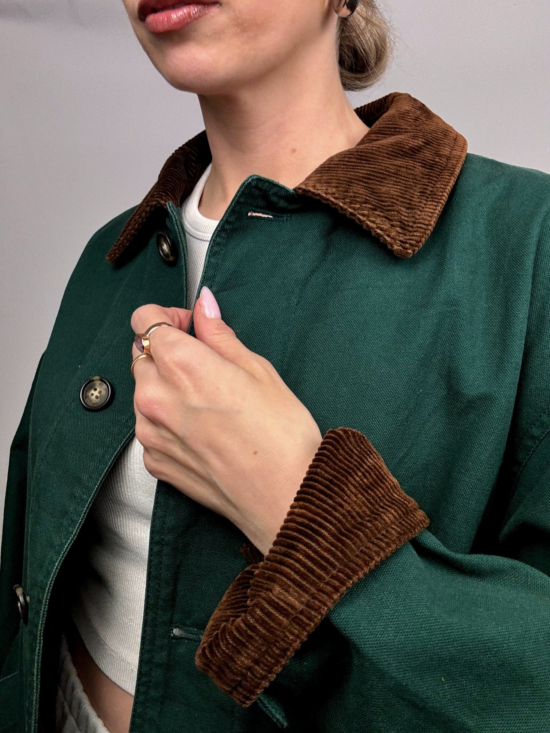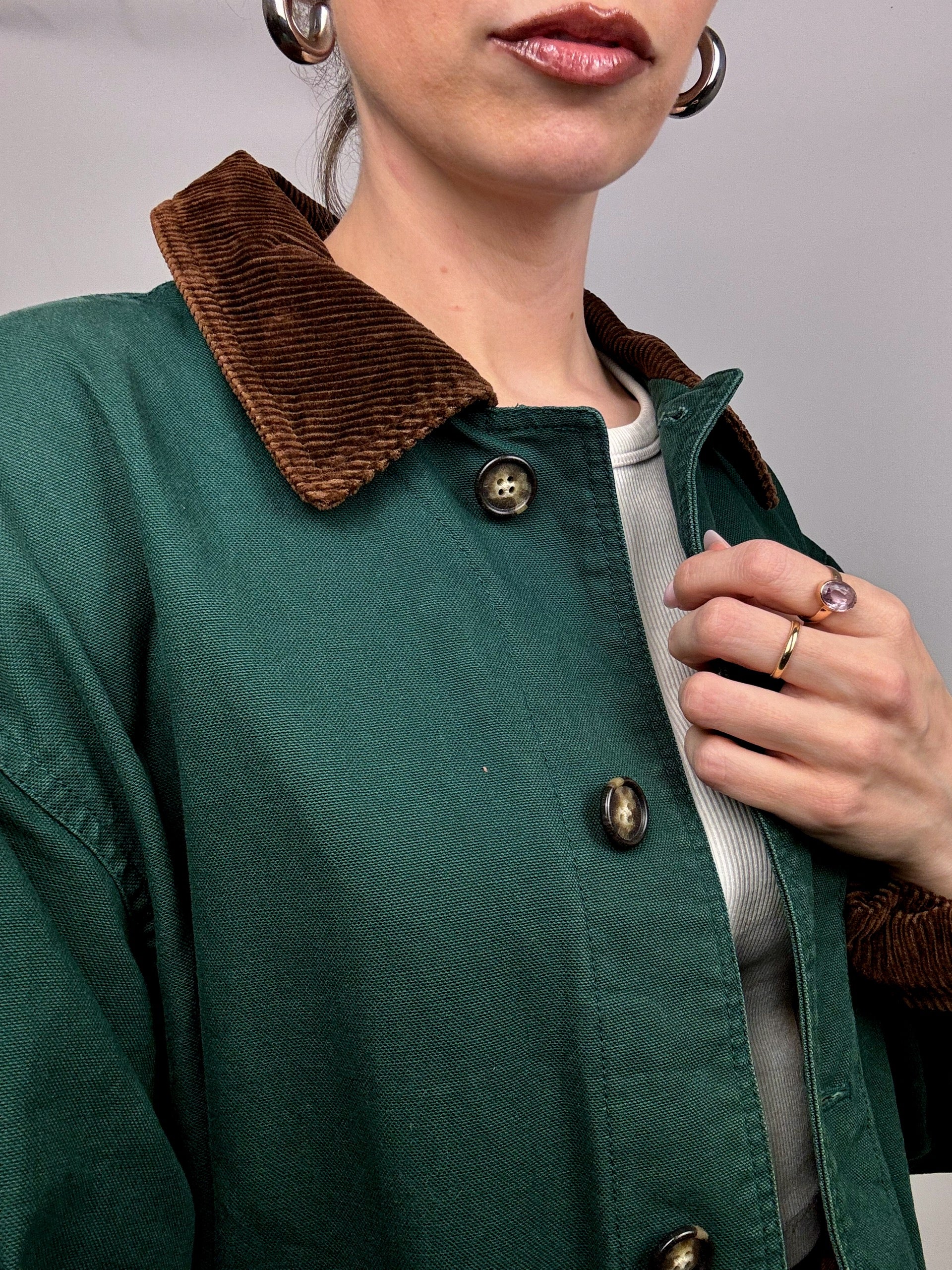 On est SUPER FAN de cette pièce, la couleur verte émeraude est magnifiquement bien relevée par son col en velours côtelé brun et assorti aux détails sur le relevé des manches ...
