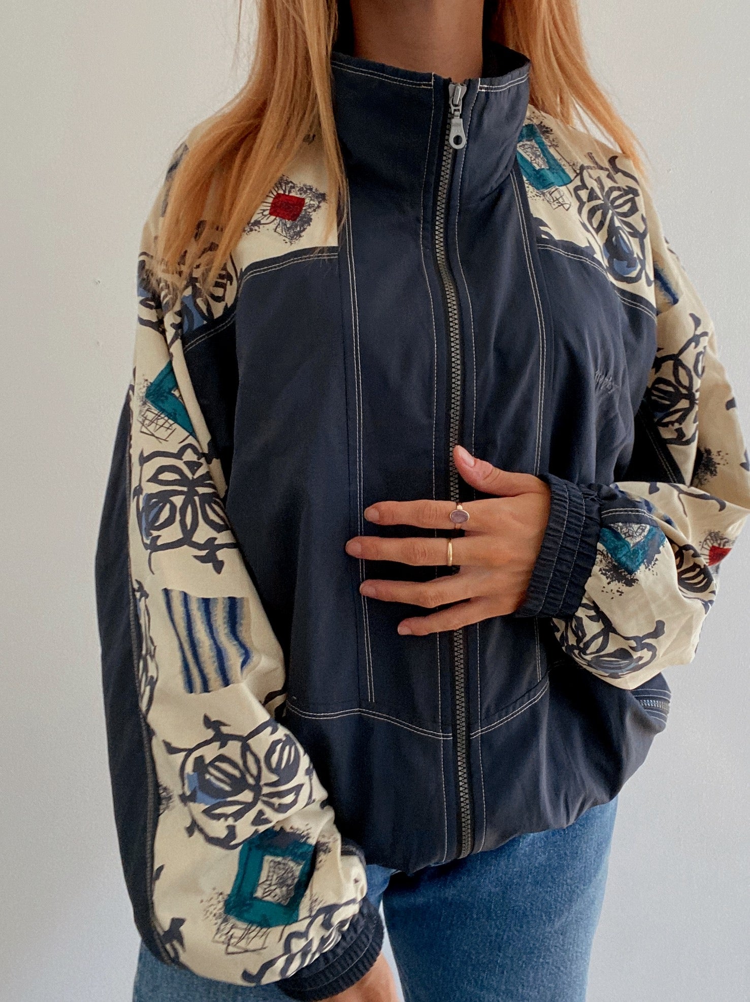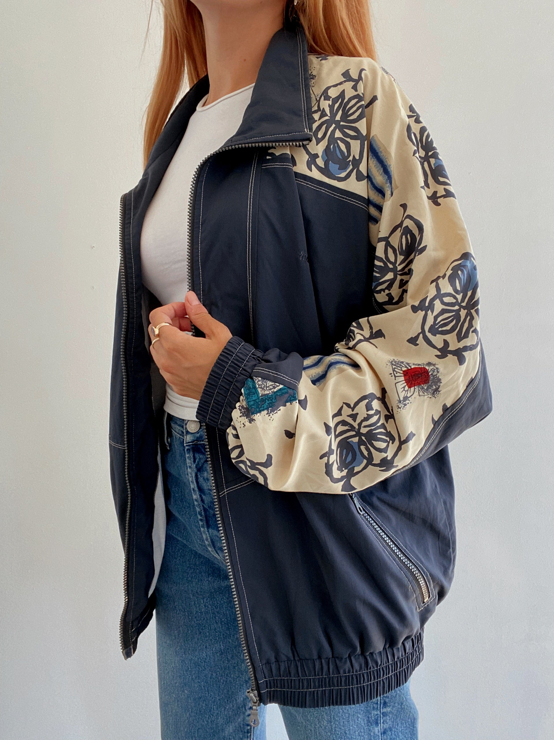 Veste vintage bleu foncée et beige à motifs L/XL