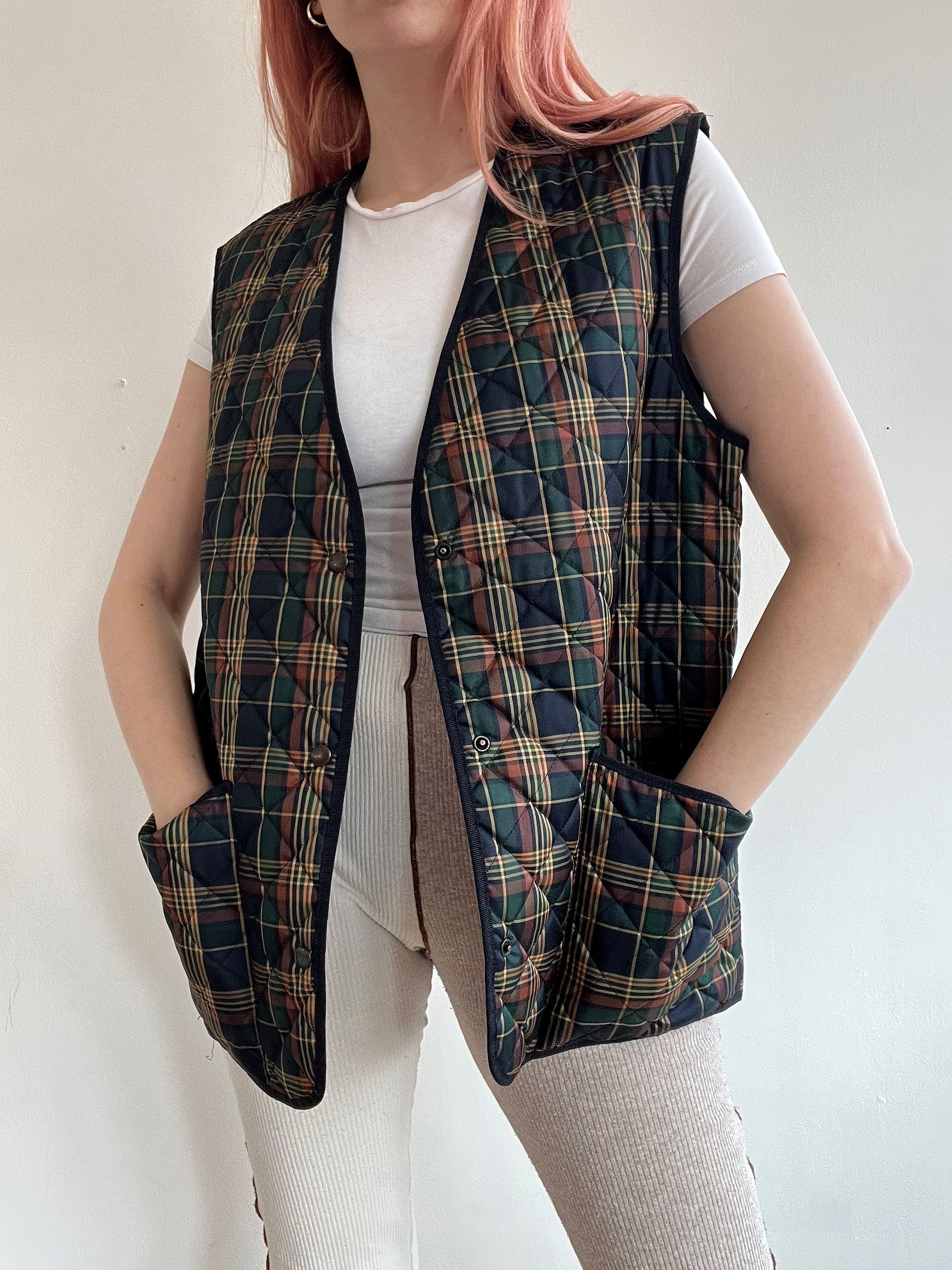 Veste vintage matelassée sans manches bleue à carreaux réversible M