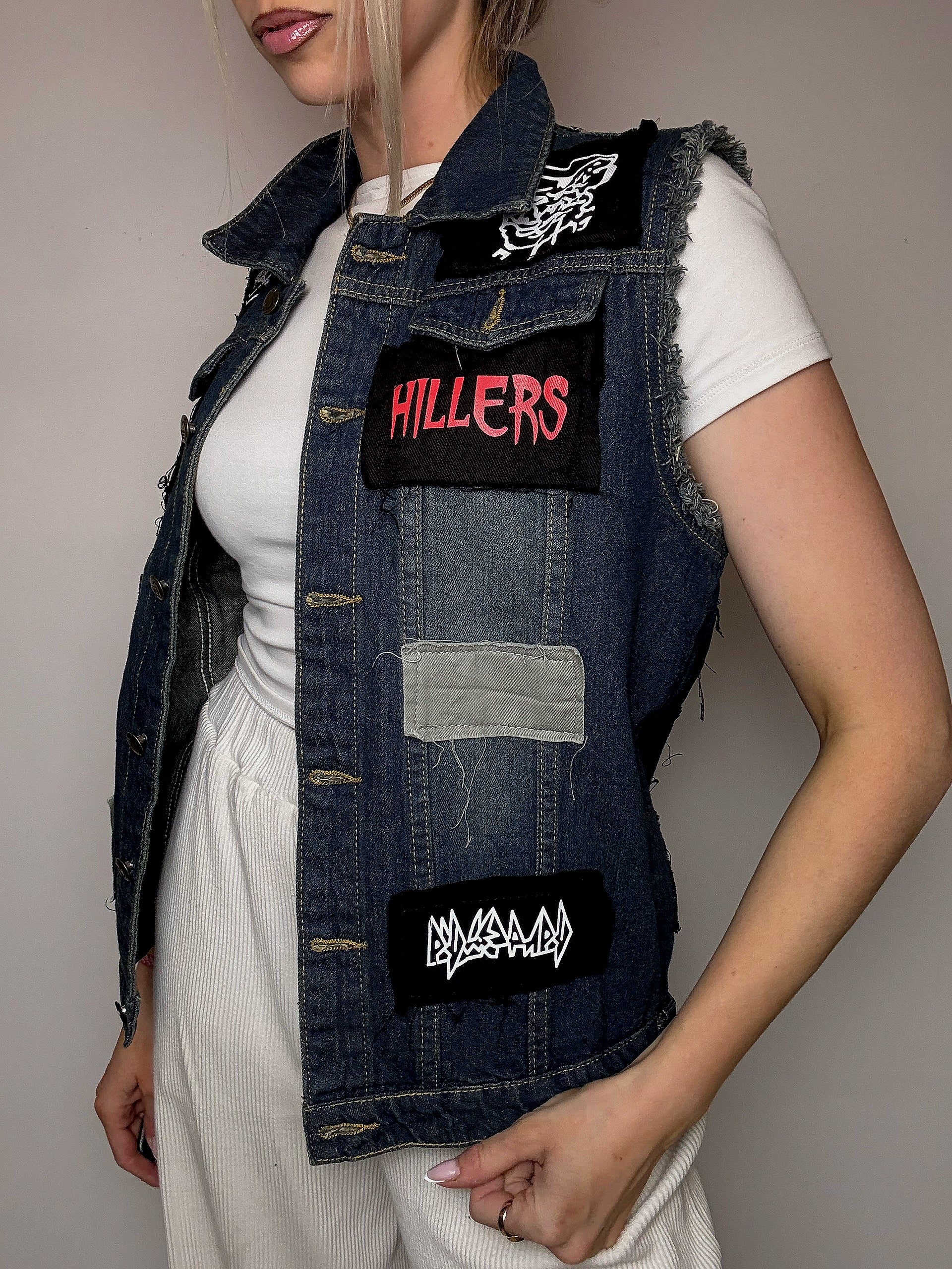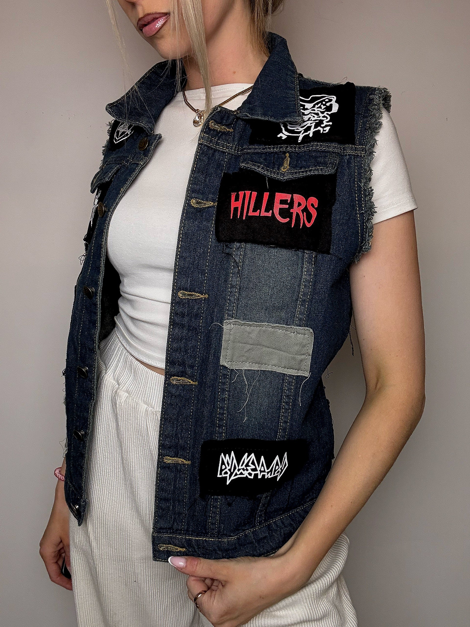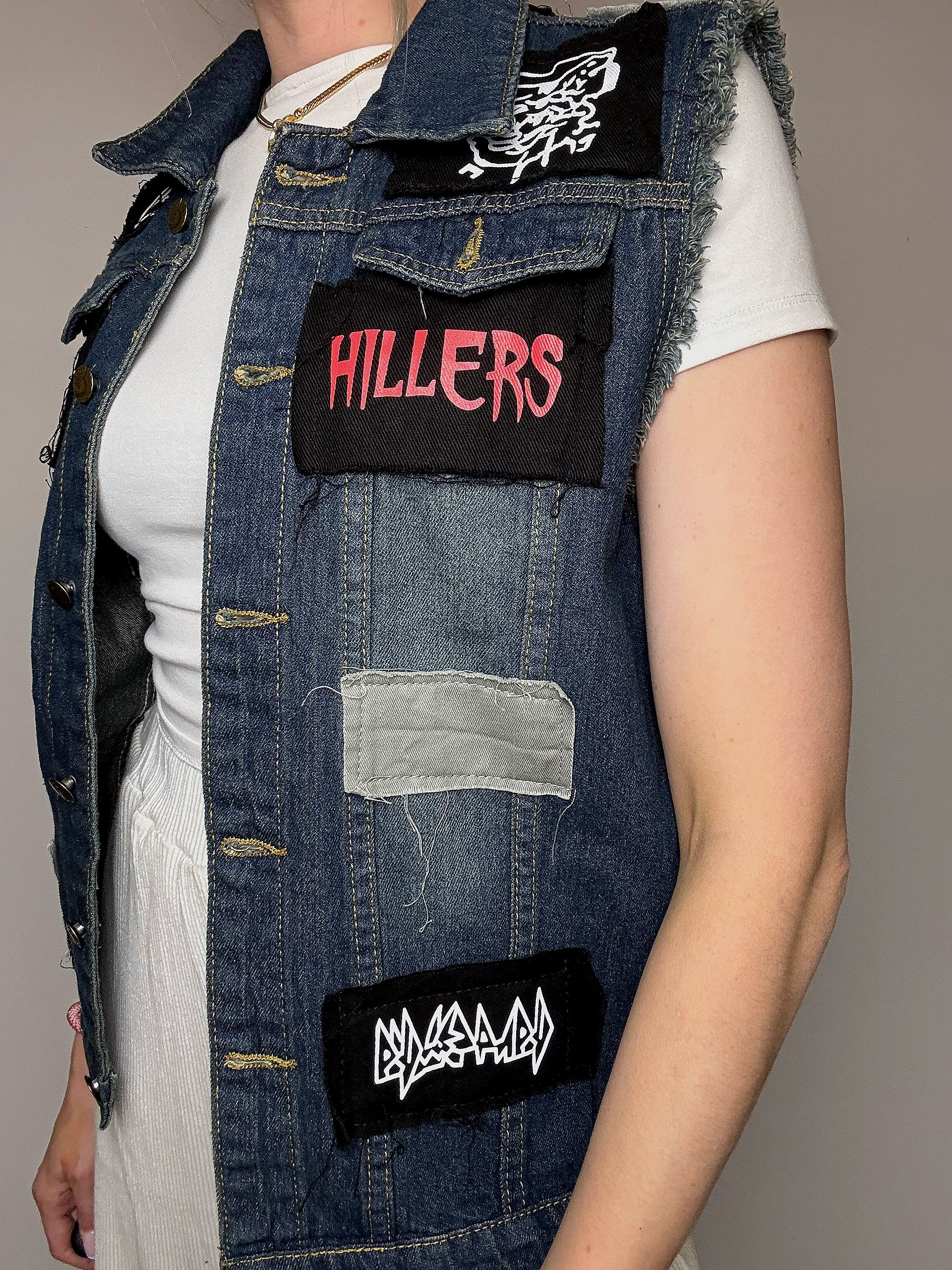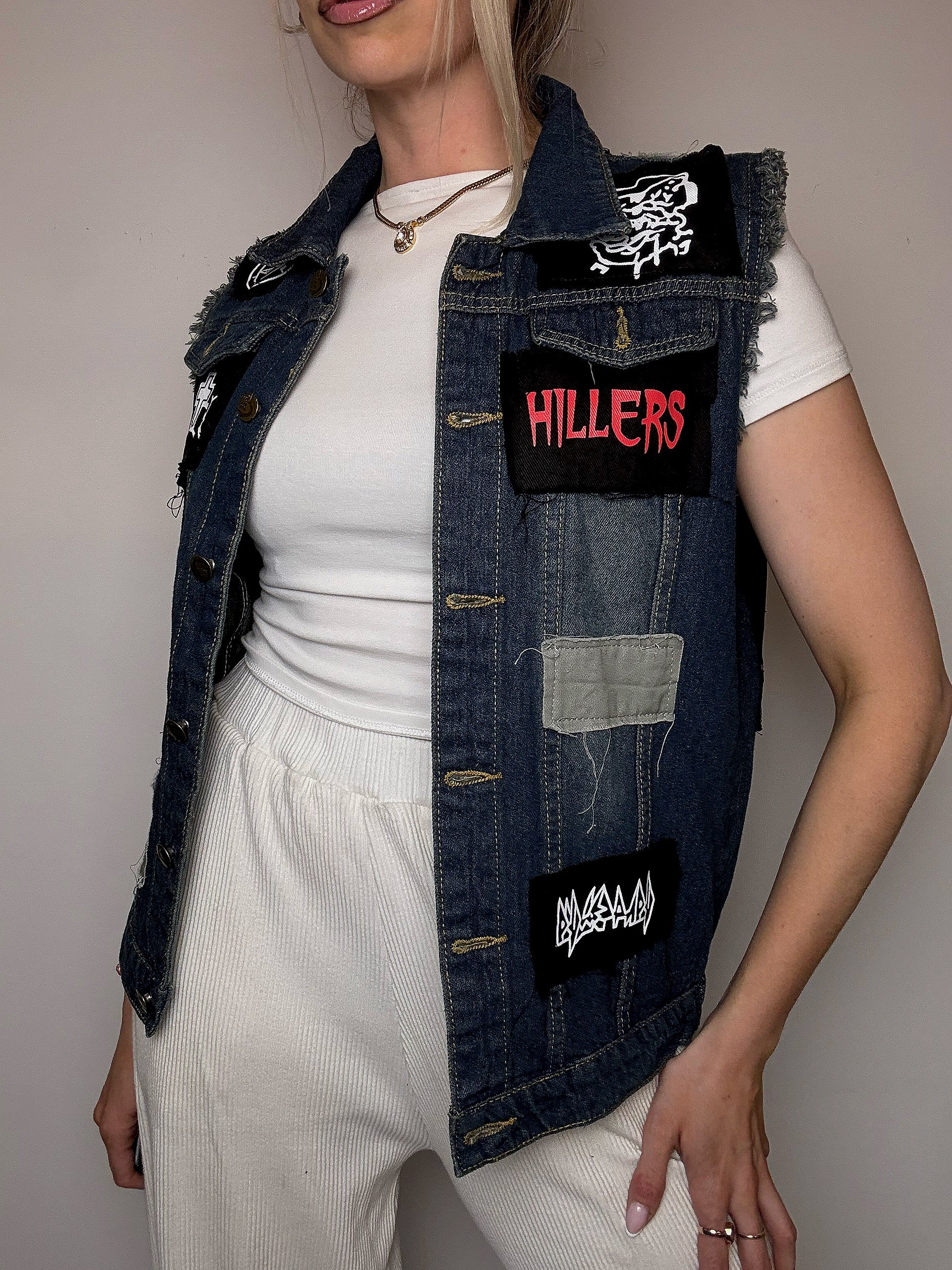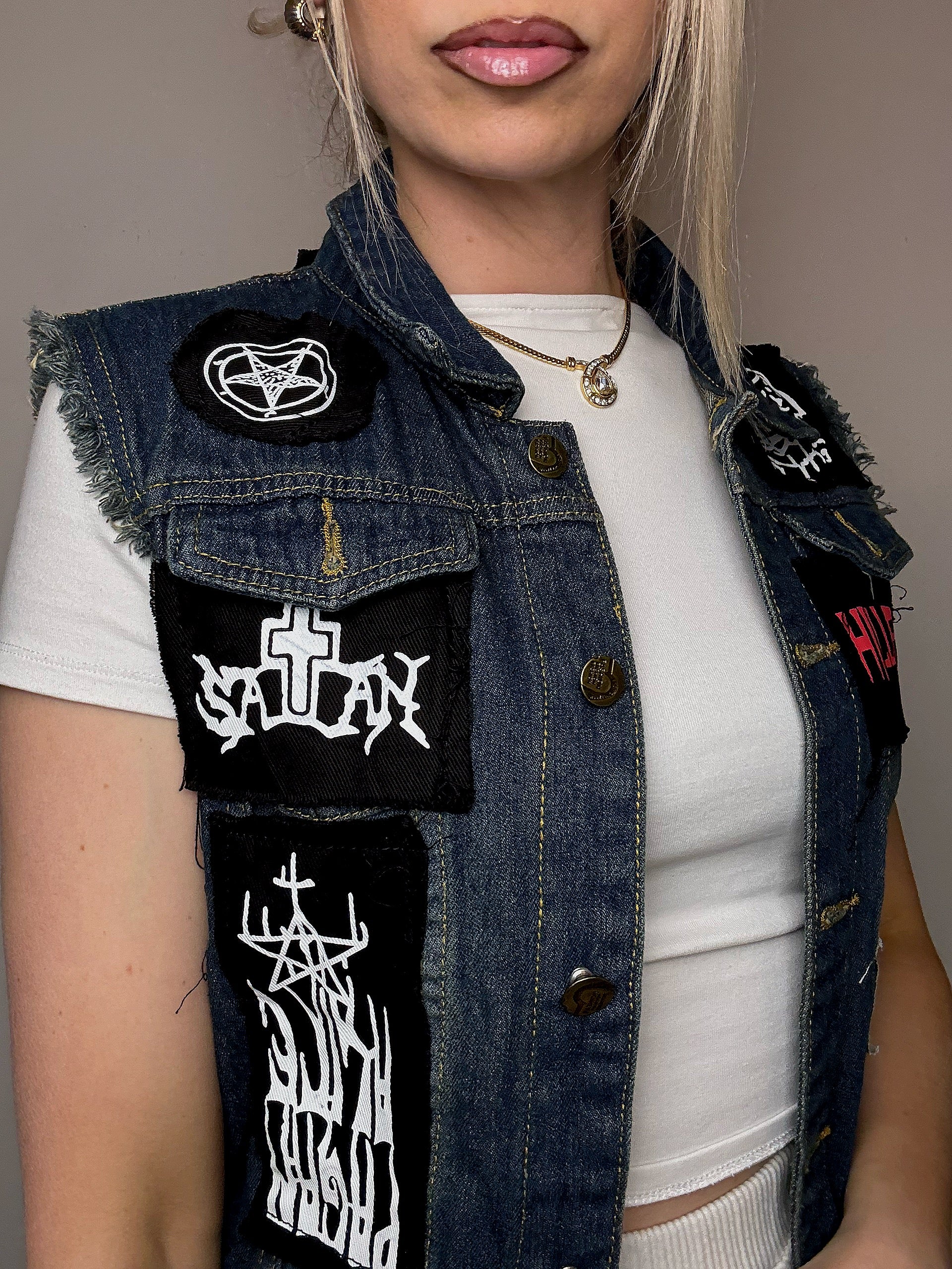 Elle a plusieurs patchs de différents groupes de metal sur toute la piece et le dos