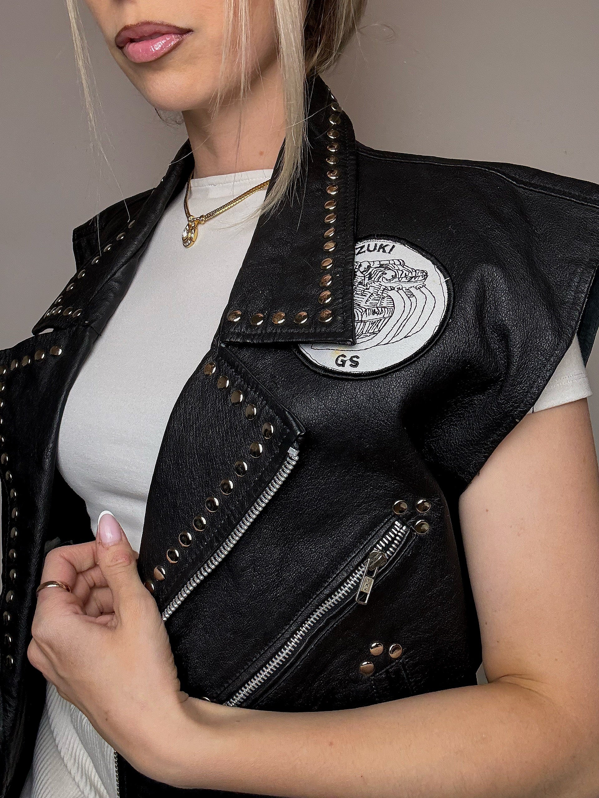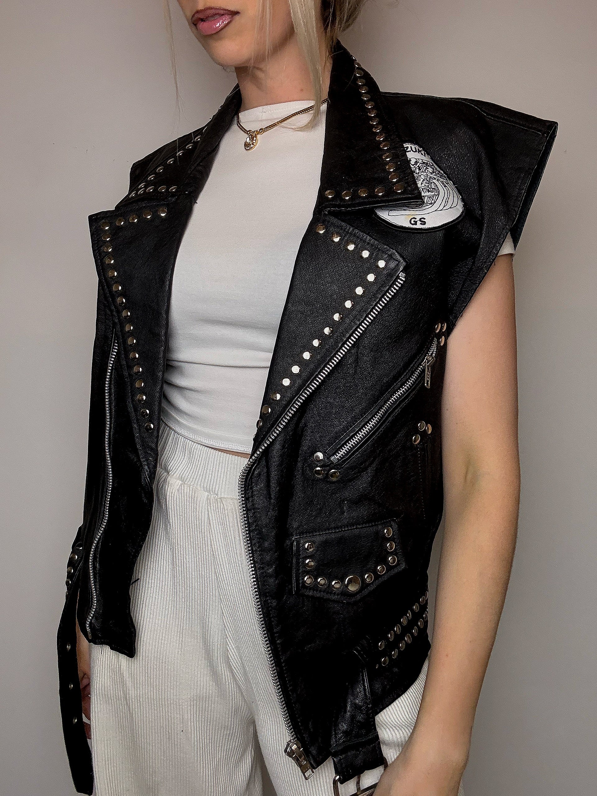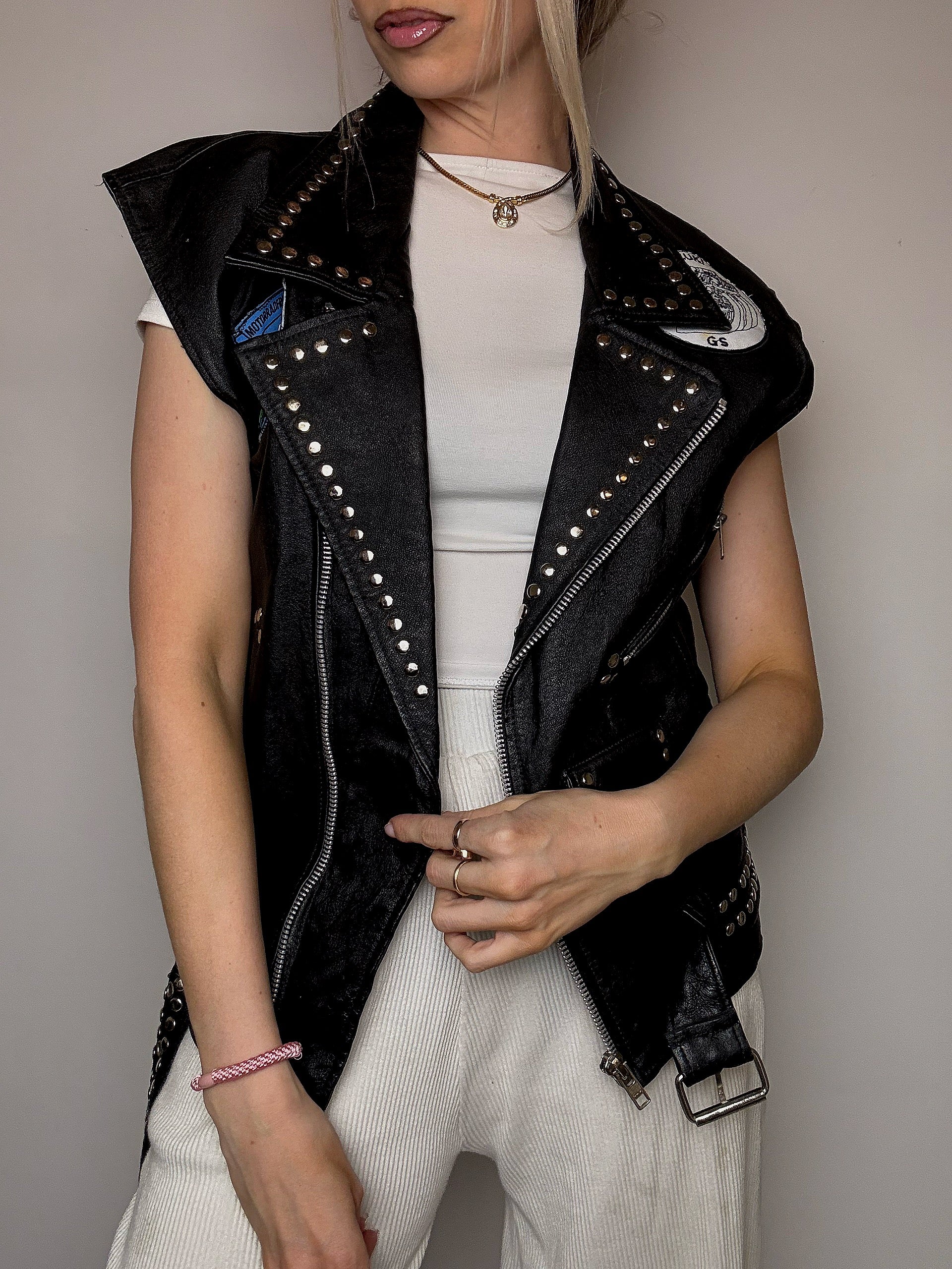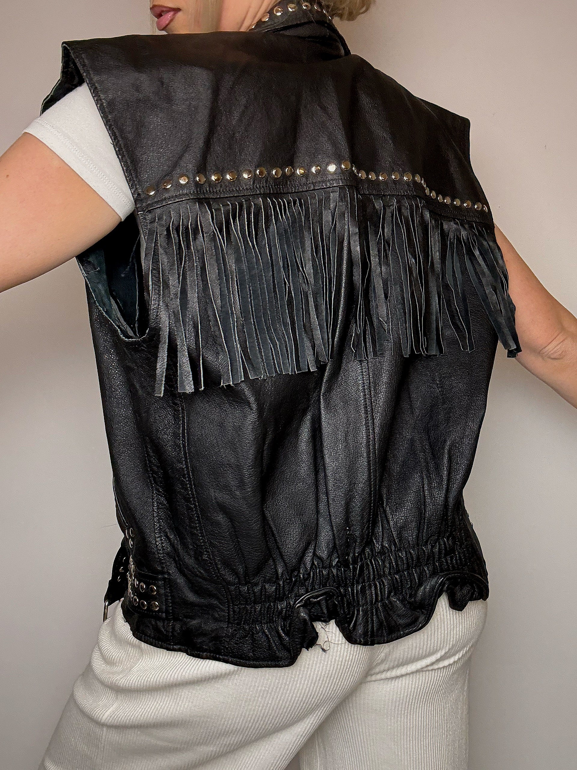 Elle a des clous sur tout le col et la ceinture, des patchs vintage sur la poitrine et surtout ce qu'on adore : des franges dans le dos !